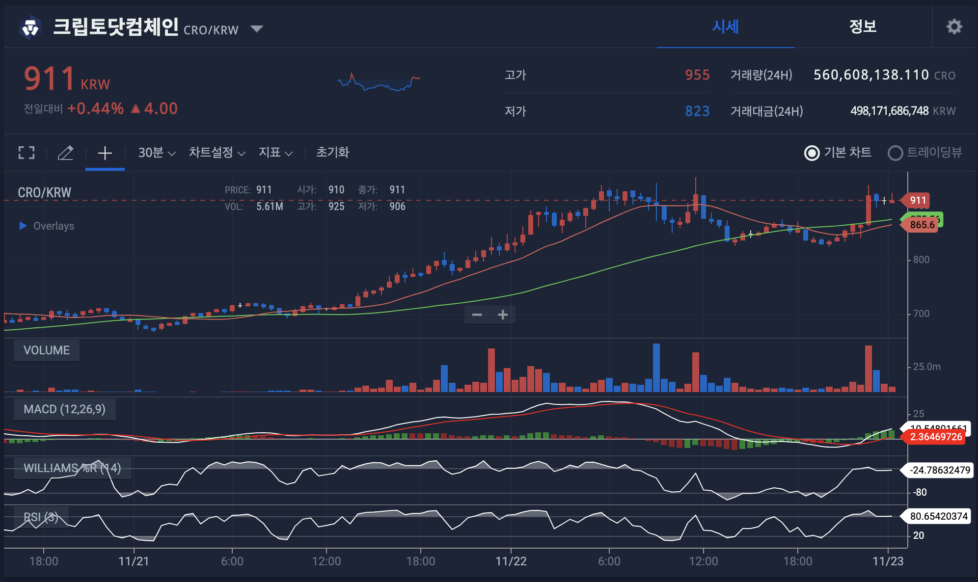 크립토닷컴체인은 현재 911원에 거래되고 있고, 신고가 955원은 11월 22일 오전 11:30시에 갱신하였다. 이는 11월 4일 오전 9시경에 300원이었던 것과 비교하면 18일 만에 3배이상이 급등한 샘이다.