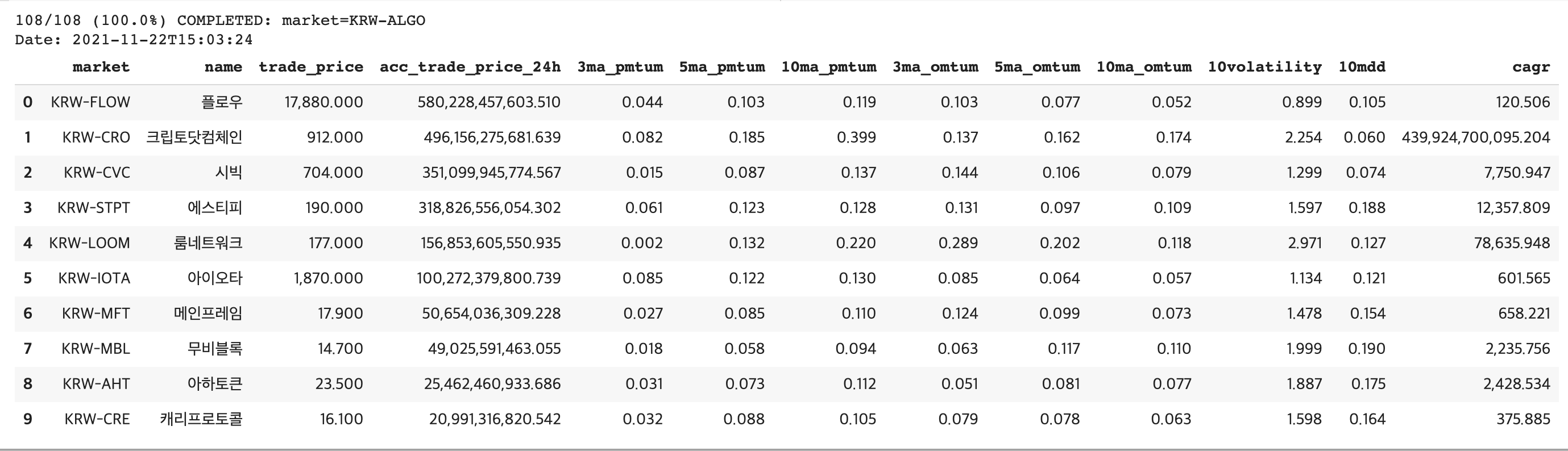 2021년 11월 23일(UTC, 2021-11-22 15:03) 분석결과 10개의 종목이 추천되었다.
