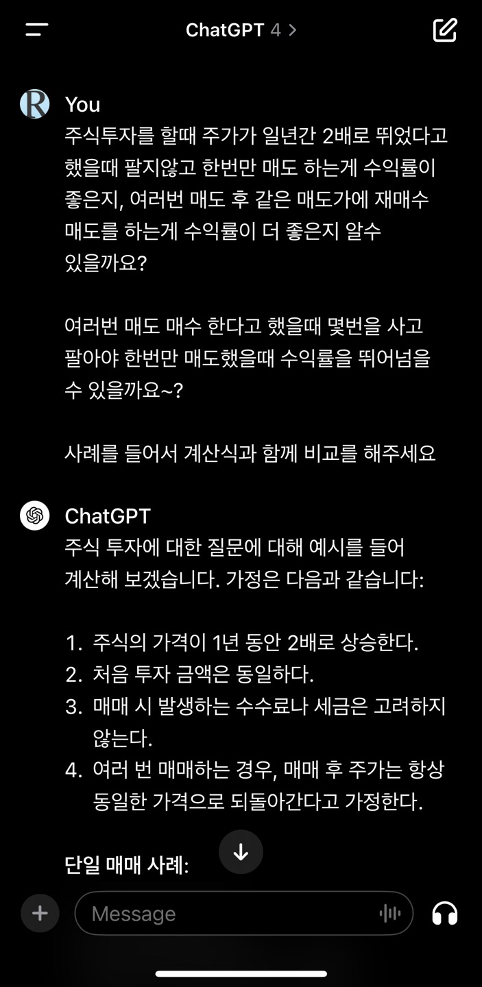즉, 주가가 1년간 2배로 상승하는 시나리오에서, 여러 번 매매를 하더라도 각 매매 시 적절한 수익률을 달성한다면 최종적인 수익률은 단일 매매 시나리오와 동일하게 됩니다. 다만, 이는 이상적인 조건(매매 시 주가가 일정하게 상승하고, 수수료나 세금이 없는 경우)에서의 계산 결과입니다. 실제 투자에서는 시장의 변동성, 매매 수수료, 세금 등 여러 요소가 수익률에 영향을 미칠 수 있습니다.