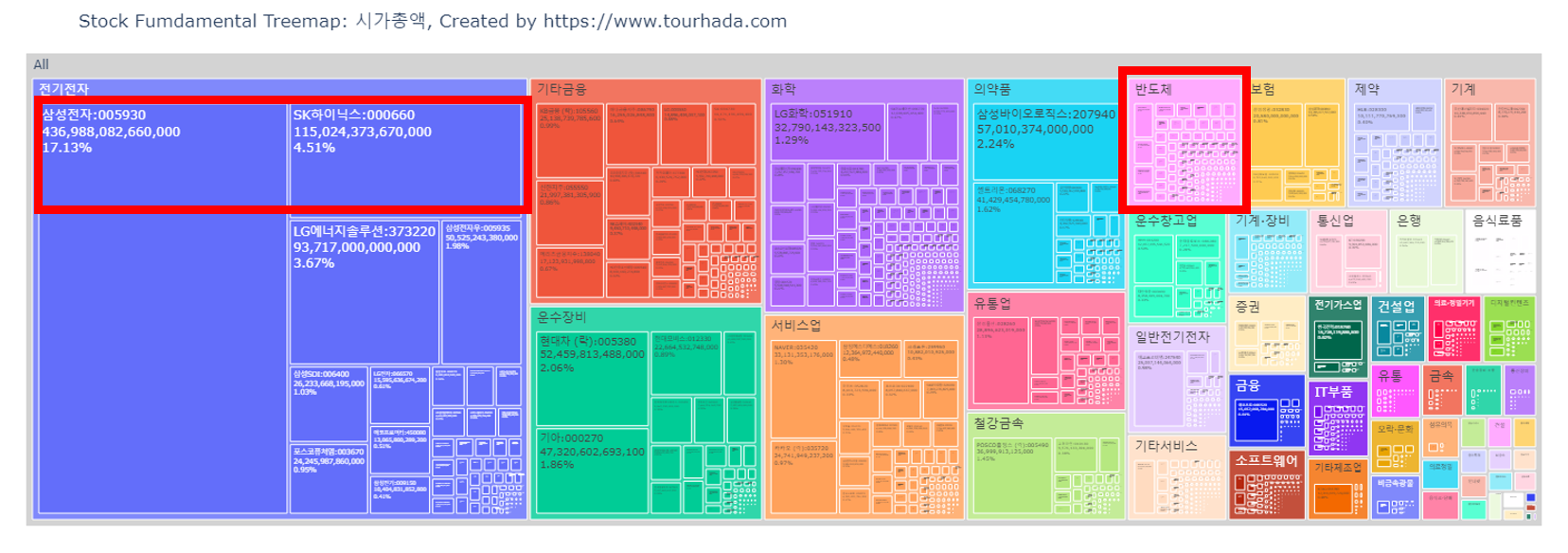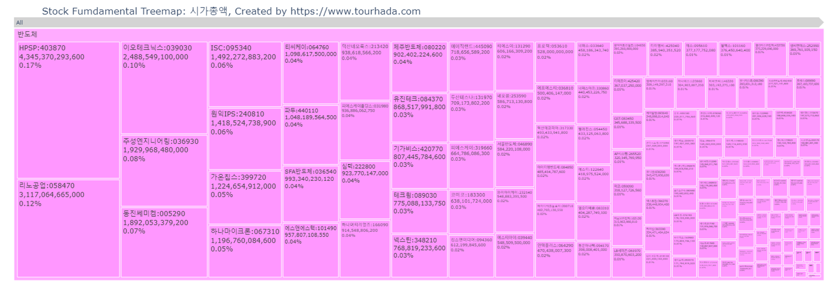국내 상장된 기업(총 2,617개) 산업 시가총액 순위를 섹터별로 나열한 것입니다. 이 중 시가총액이 높은 삼성전자와 SK하이닉스는 전기.전자 산업군으로 분류가 되어있습니다. 이들 중 반도체 산업 분류된 기업은 143개 기업이 있고, 전체 상장된 기업 들 중에 5.5%에 해당합니다.