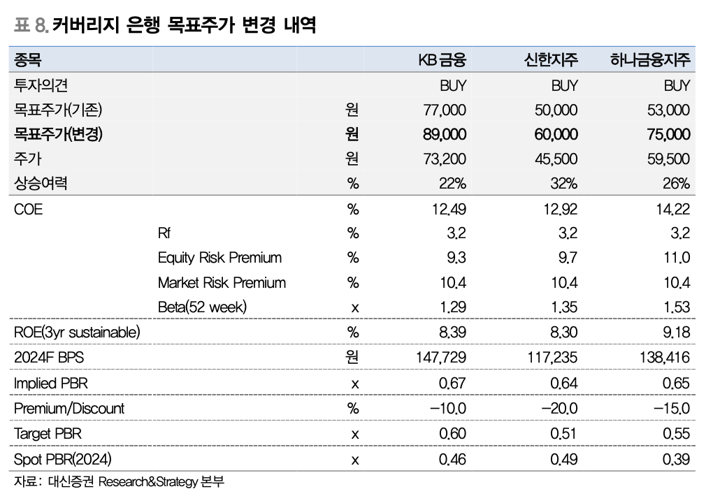 만년 저 PBR이었던 금융주에게 이런 기회가 찾아온 것은 실로 오랜만이고, 주가가 크게 올랐지만 은행/증권의 sustainable ROE가 8~9%, 보험이 13.8%임을 감안하면 여전히 Valuation은 부담 없다. KB금융 기준 역사적 Valuation 고점은 0.74x로 금리 상승에 따 른 이자이익의 비약적 개선과 성공적인 M&A로 비이자이익이 증가하며 ROE가 크게 상승한 시기였다. 전술한 바와 같이 금융지주의 지속가능한 ROE가 8~9%, 보험사는 13% 이상임을 감안하면 각 섹터 당 가장 높은 Valuation을 받는 KB금융, 삼성화재 기 준 각각 PBR 0.7x, PBR 1.0x까지 멀티플 상승이 가능하다는 판단이다. 그리고 무엇보다 우리가 앞서 분석한 바와 같이 정책이 연내 지속적으로 업데이트 될 것이고 지수 및 ETF조성 등으로 긍정적인 수급을 기대하는 바 KB금융, 신한지주, 하나금융지주와 증권 커버리지 5사의 목표주가를 상향 조정한다. 목표주가 상향 근거는 2024년 BPS적용 및 금리 하락에 따른 COE 조정이다.