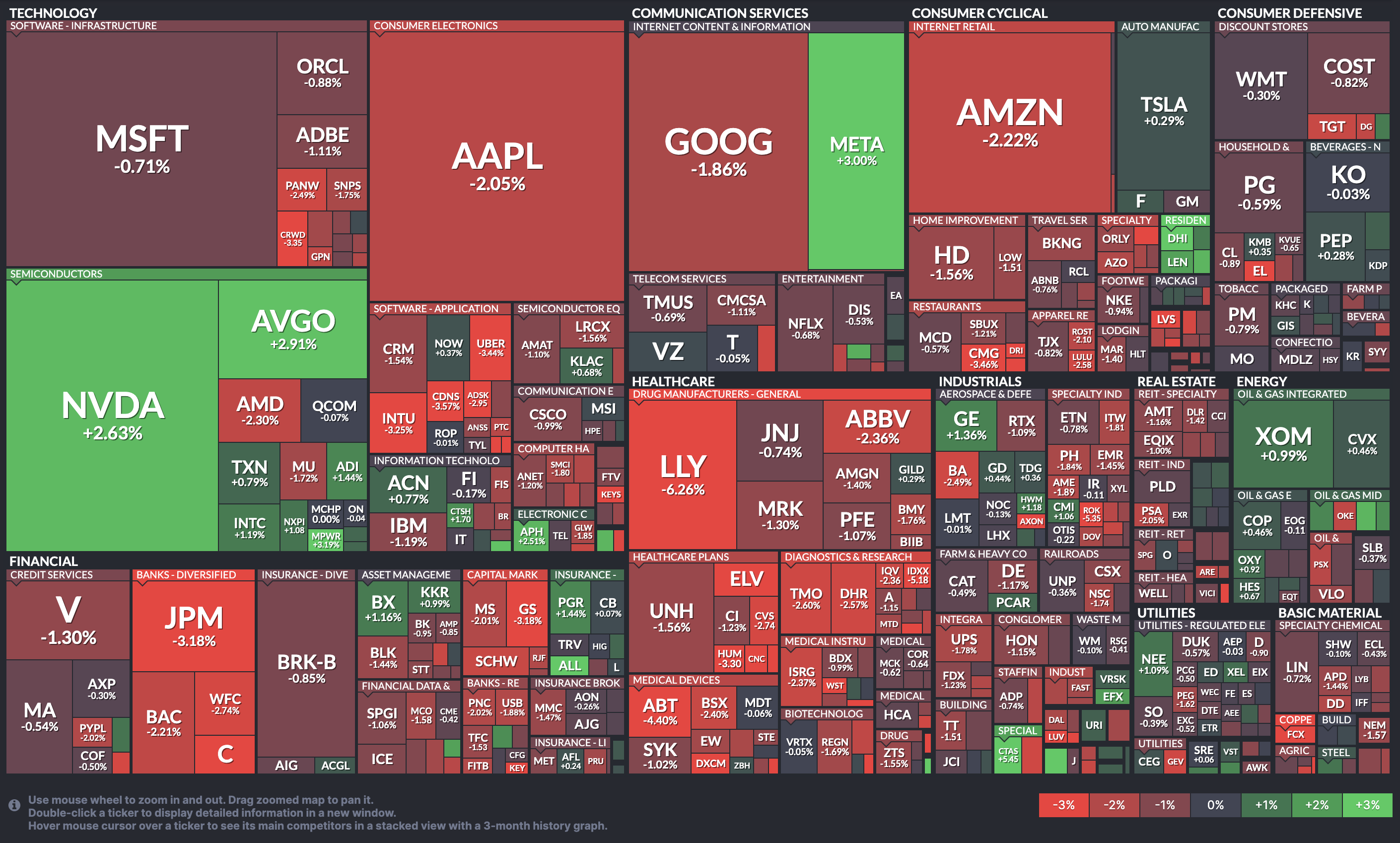 수요일에는 나스닥이 2022년 12월 이후 최악의 하루 성과를 보였으며, 나스닥이 2.5% 이상의 손실을 기록한 반면 블루칩 다우는 상승을 기록한 2001년 이후 처음입니다. 하지만 목요일의 매도는 기술주에 국한되지 않았습니다. S&P 500을 구성하는 11개 섹터 중 하나를 제외한 모두가 하락했으며, 다우 구성 종목 중 10개 중 9개가 손실을 보였습니다. 중소형주 중심의 러셀 2000도 금리 인하 기대 속에 상승했지만, 약 1.9% 하락했습니다.