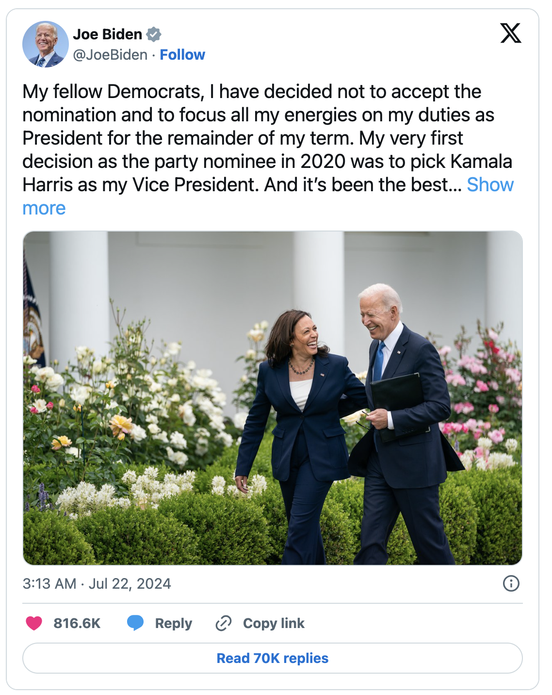 - 바이든 대통령은 소셜 미디어 플랫폼 X에 "대통령으로서 여러분을 섬긴 것은 제 인생의 가장 큰 영광이었습니다. 재선에 도전하려는 의도가 있었지만, 당과 국가의 이익을 위해 지금은 물러서고 남은 임기 동안 대통령의 임무에 집중하는 것이 최선이라고 생각합니다."라고 게시했습니다.