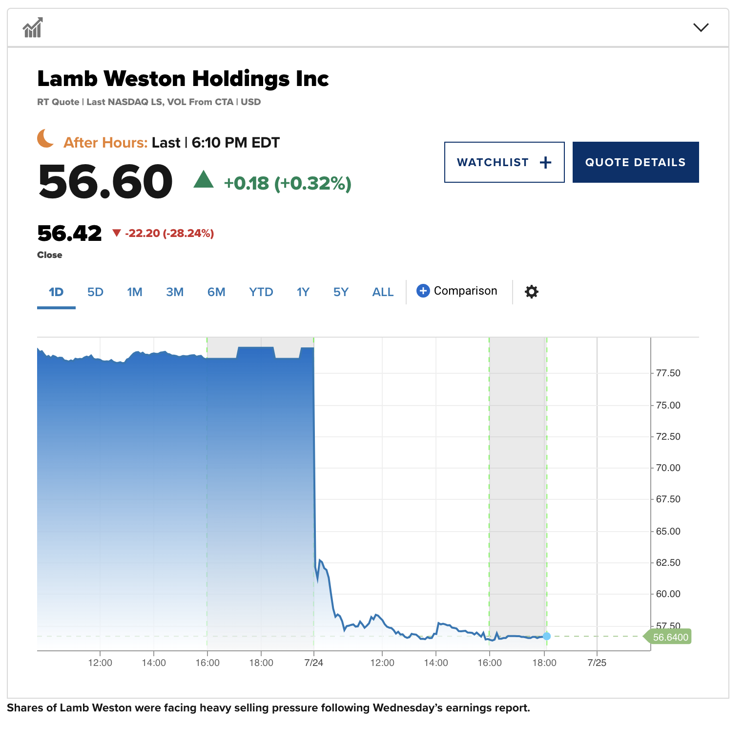 소비자들이 여전히 상징적인 사이드 메뉴에 돈을 아끼지 않고 있지만, 고객들이 허리띠를 졸라매면서 레스토랑 트래픽 감소가 사업에 타격을 주고 있다고 회사는 밝혔습니다. Lamb Weston은 4분기 실적이 FactSet이 조사한 애널리스트들의 예상치를 밑돌아 수요일 세션에서 주가가 27% 이상 하락했습니다.