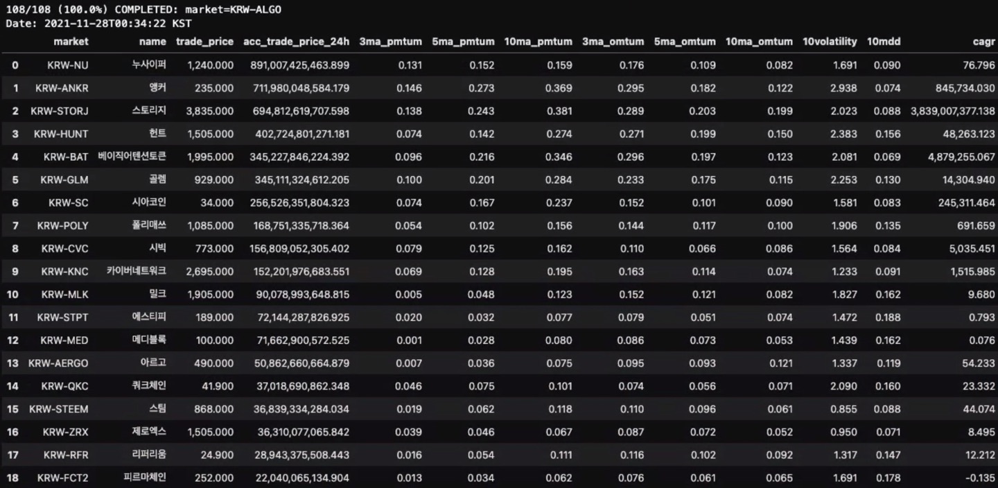 이번에는 데이터 분석 알고리즘을 약간 수정해서 가격 변동성(Volatility) 뿐만아니라, 추세-추종 매매 기법과 관련된 공식을 넣어서 함께 분석해보고 우리만의 오픈 모멘텀을 만들어서 랭킹을 뽑는데 활용해 보았다. 그리고, 우선순위도 실제 업비트(Upbit) 같은 한국 거래소 거래대금이 높은 순서 대로 순서를 정해서 데이터 분석결과 순위와 비교하기 쉽게 서열을 정리해 보았다.