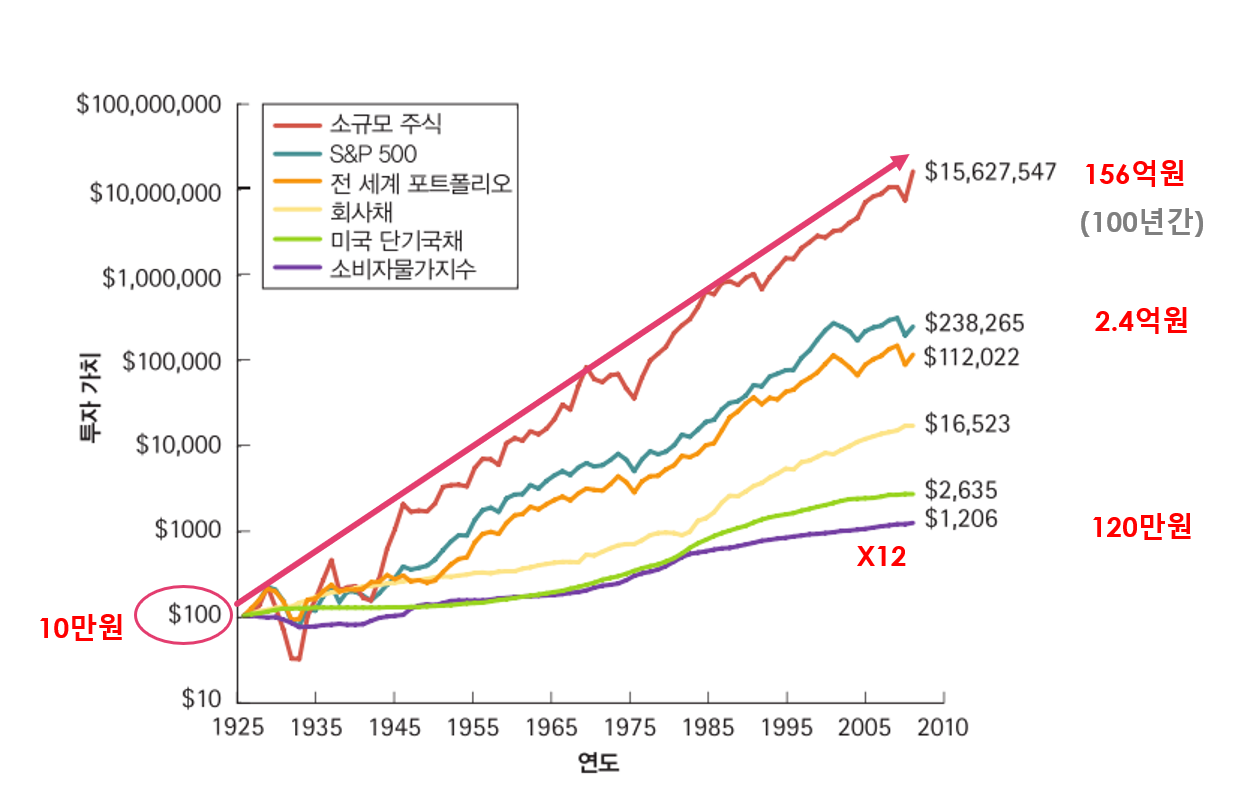 1925년에 투자되었던 $100 (대략 10만원) 주식은 2010년 무렵 거의 100년 후에는