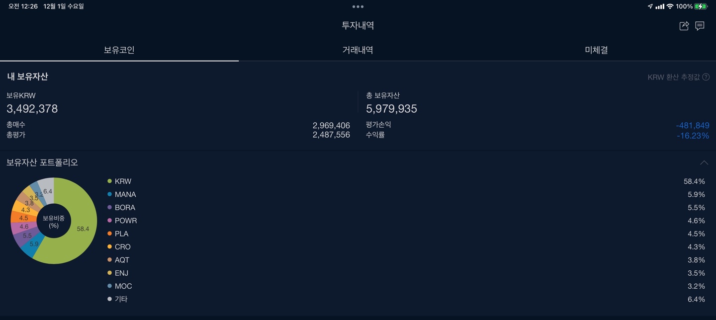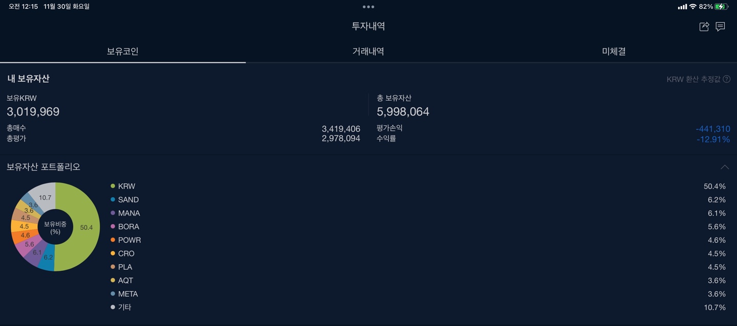 11월 30일 캡처한 투자 내역 내 보유자산 기준으로 본다면, 500만원 초기 투자금에서 마이너스 수익까지 모두 합산해보면 5,998,064 + 441,310 = 6,439,374원이 투자 수익금이 됩니다.