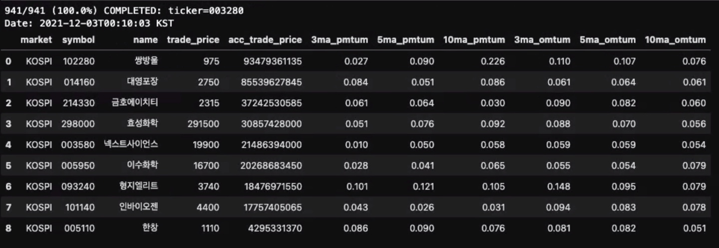 2021년 12월 3일 퀀트 분석 결과 국내 주식 종목들 중에 코스피(KOSPI) 상장된 941개 중에 9개 종목이 추천되었다.