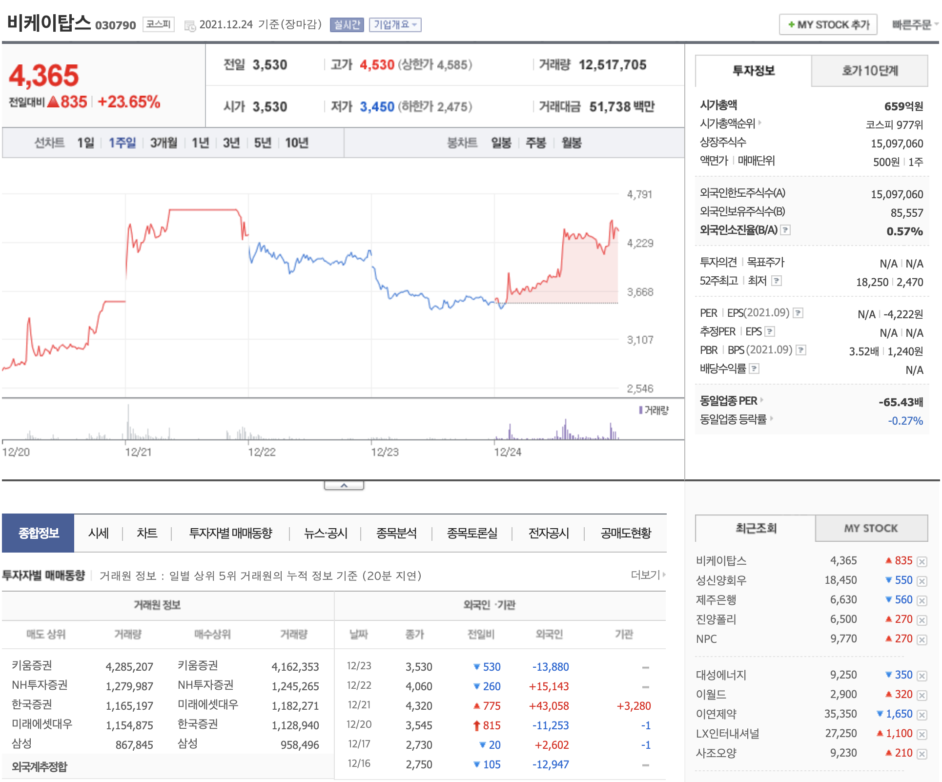 포트폴리오에서 샤프비율(sharpe ratio, 리스크프리미업 대비 수익률이 가장 좋은 비율)에서 비케이탑스가 가장 높은 비중(51.2%)으로 구성을 추천 했고, 이 종목의 1주일, 3개월 간의 주식 시세 차트 변화를 살펴보았다.