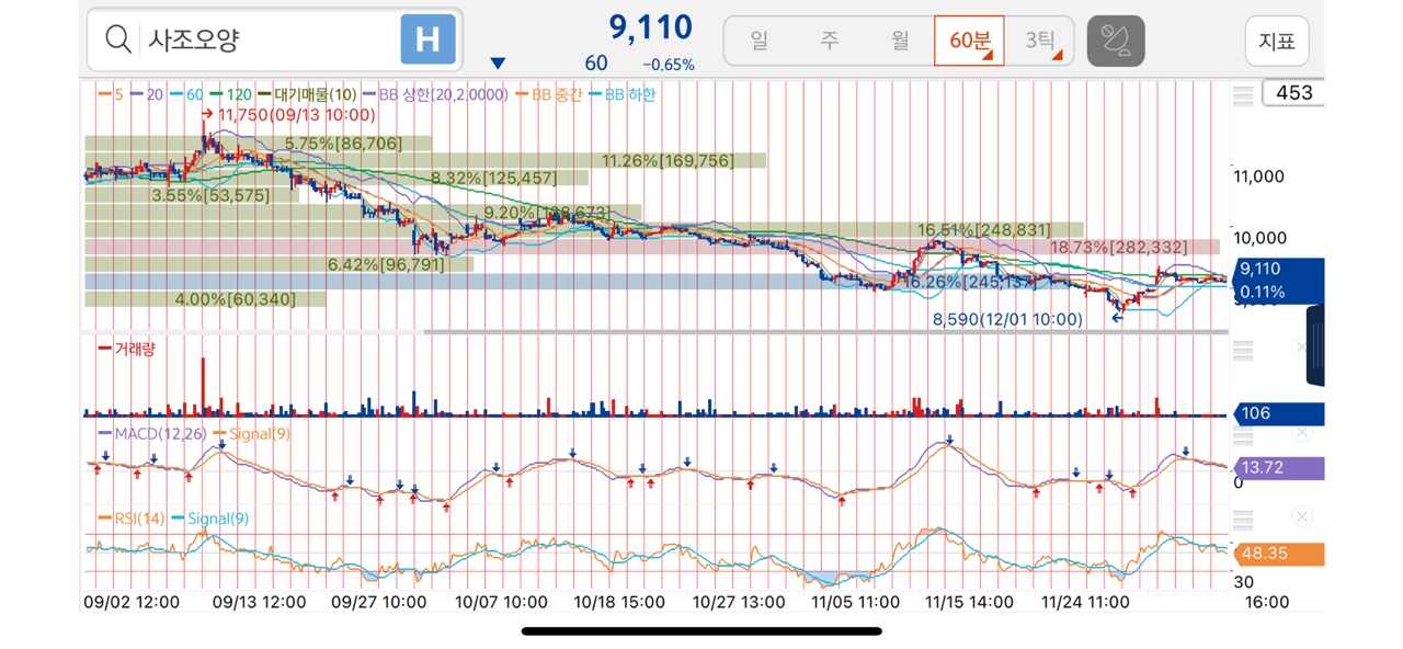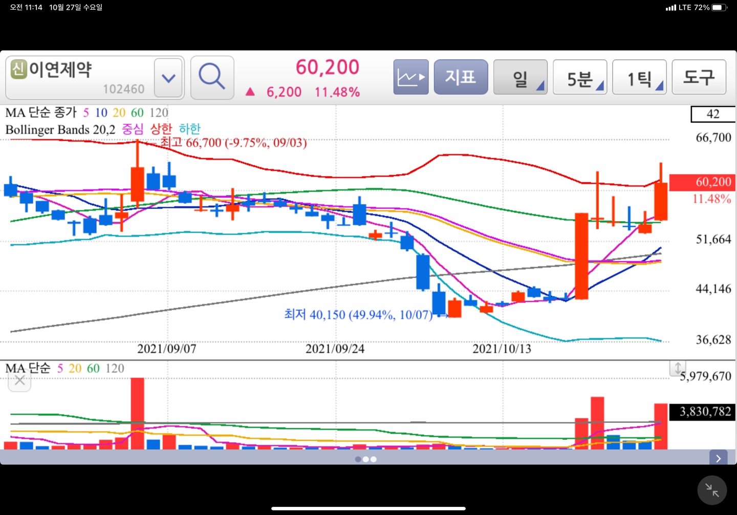 10월 중순에 저점에서 상승시점인 48,527원에 220개 매수 해서 2주만에 많은 수익률을 안겨다준 사례가 되었다.