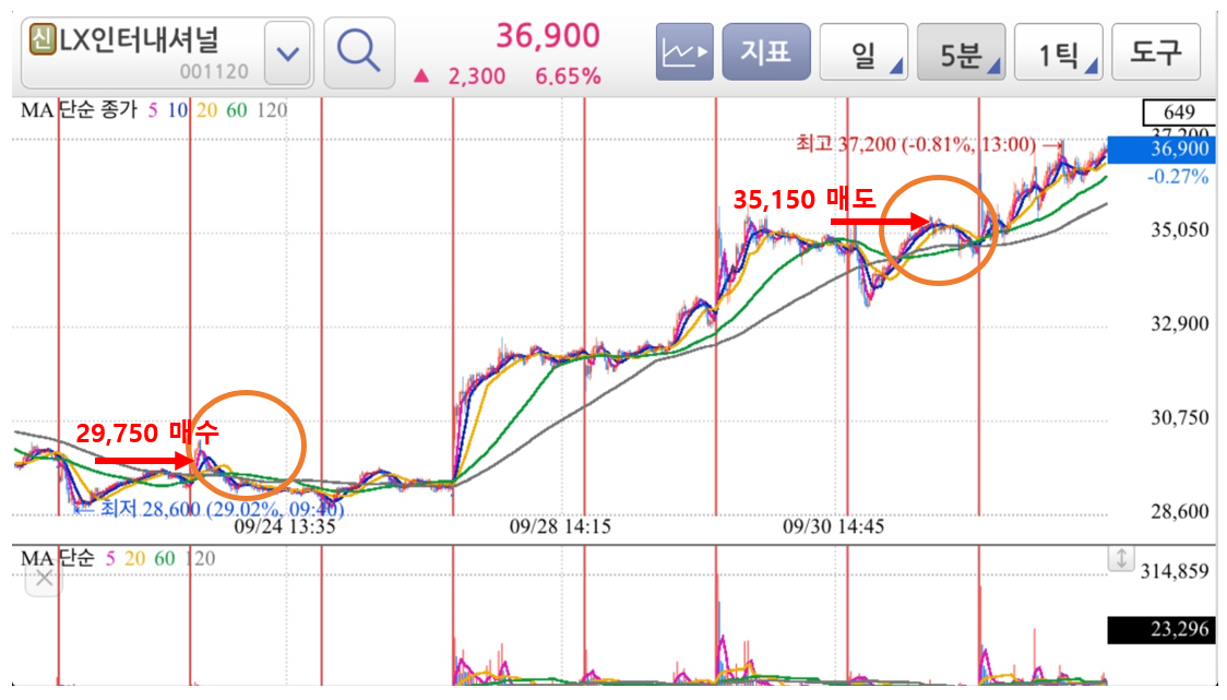 9월 24일 금요일 매수 평균가는 29,750원이었고, 10월 1일 금요일 매도 평균가는 35,150원 이었다.