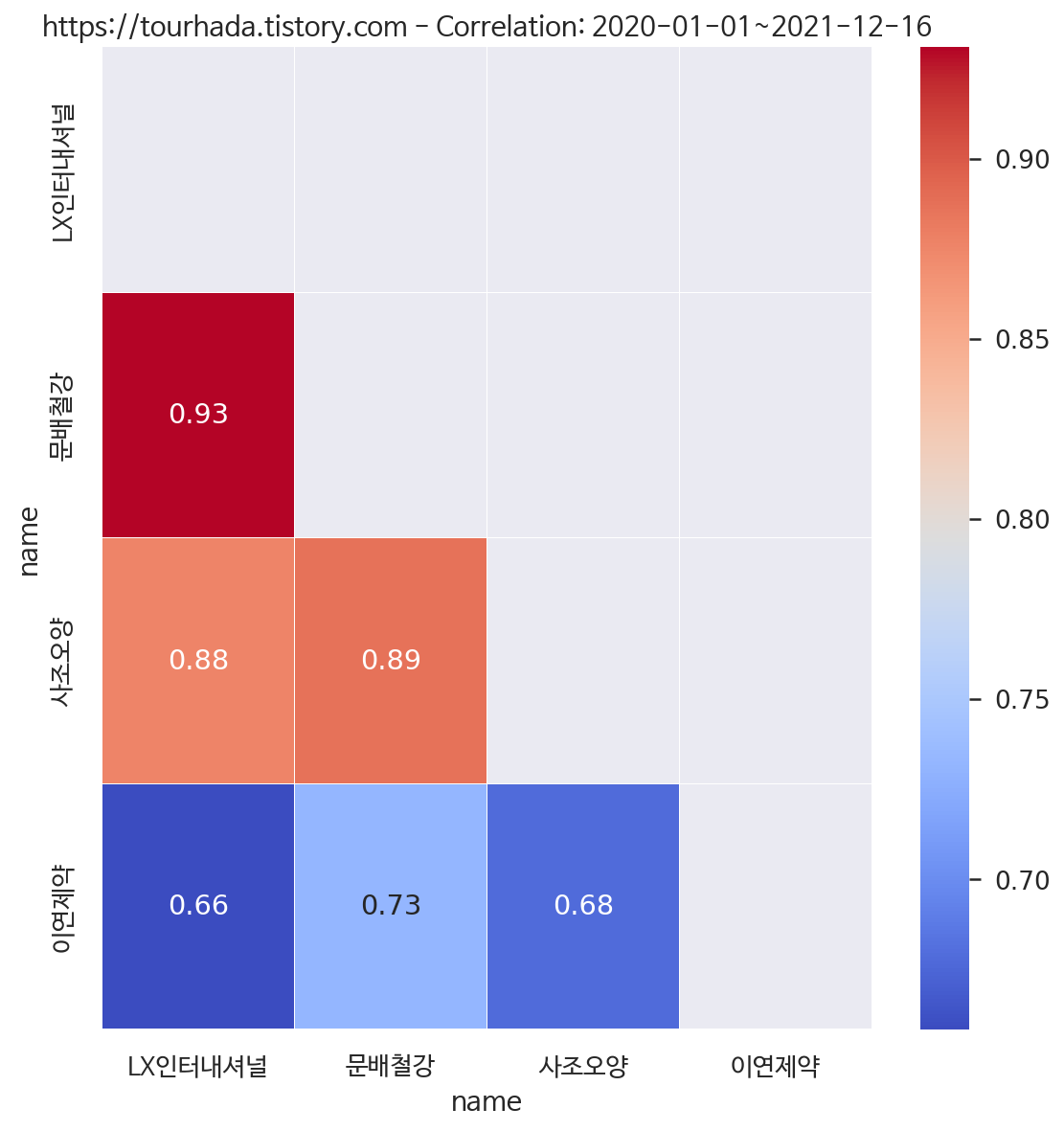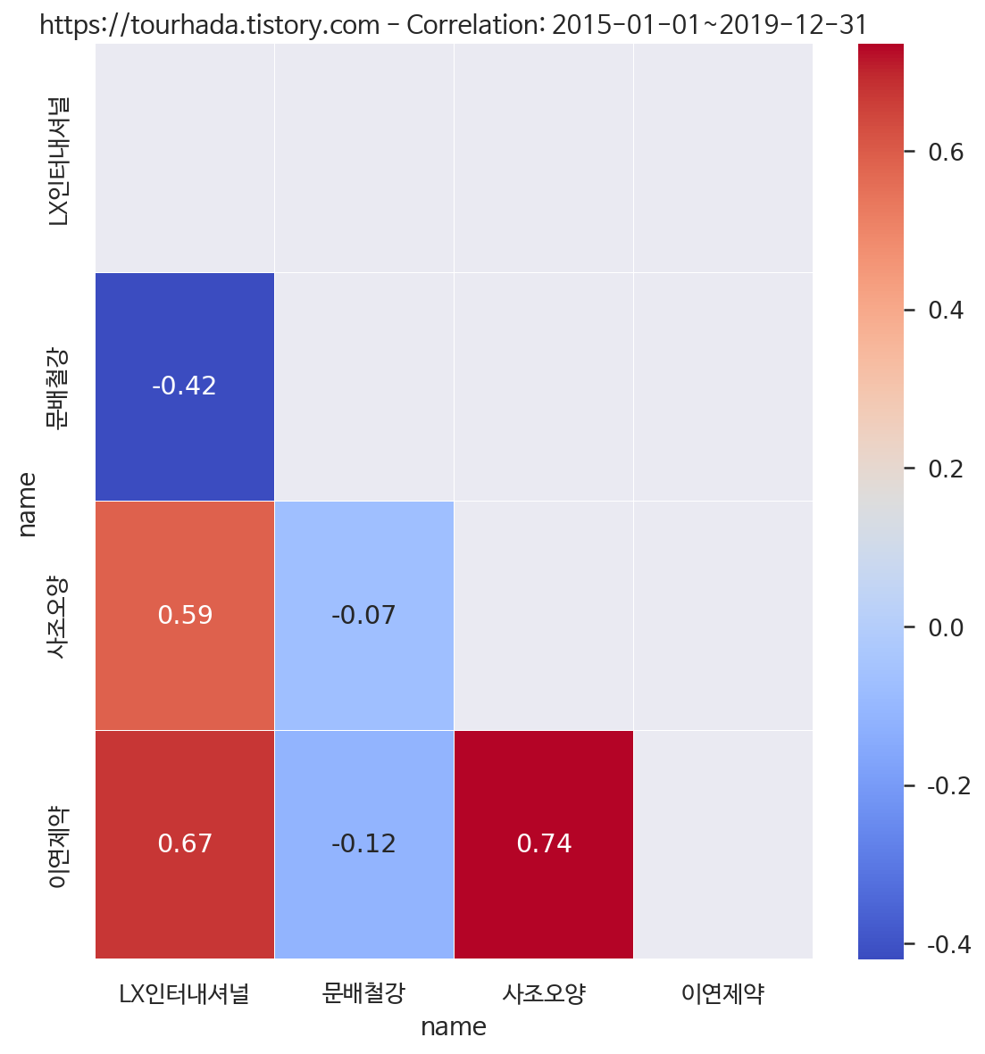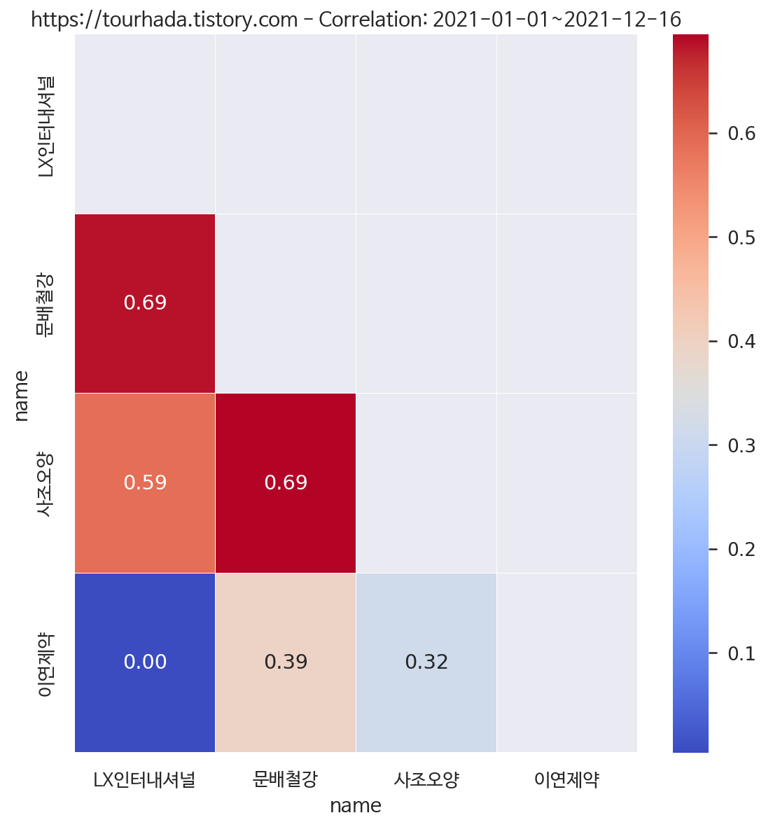 위드 코로나 기간인 1년간(우) - 2021년 1월 1일 ~ 2021년 12월 8일동안 상관관계를 분석했을때, LX 인터내셔널과 이연제약만 그나마 0.06으로 가장 낮은 수치의 상관관계를 보였고, LX인터내셔널과 문배철강이 0.74로 제일 높은 양의 상관관계를 보였다.