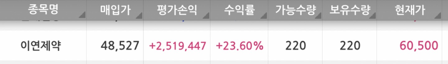 10월 27일 기준 이연제약 수익률이 23.60% 급등구간에서 60,500원에 전량 매도해서 총 2,519,447원의 수익을 안겨다 주었다.