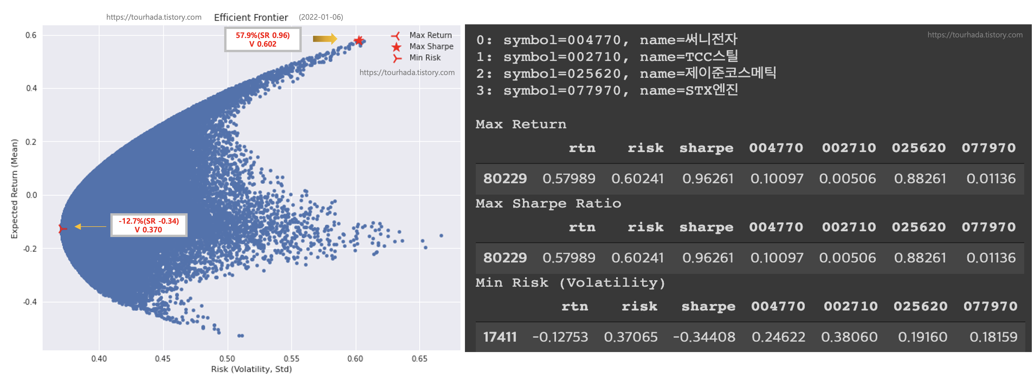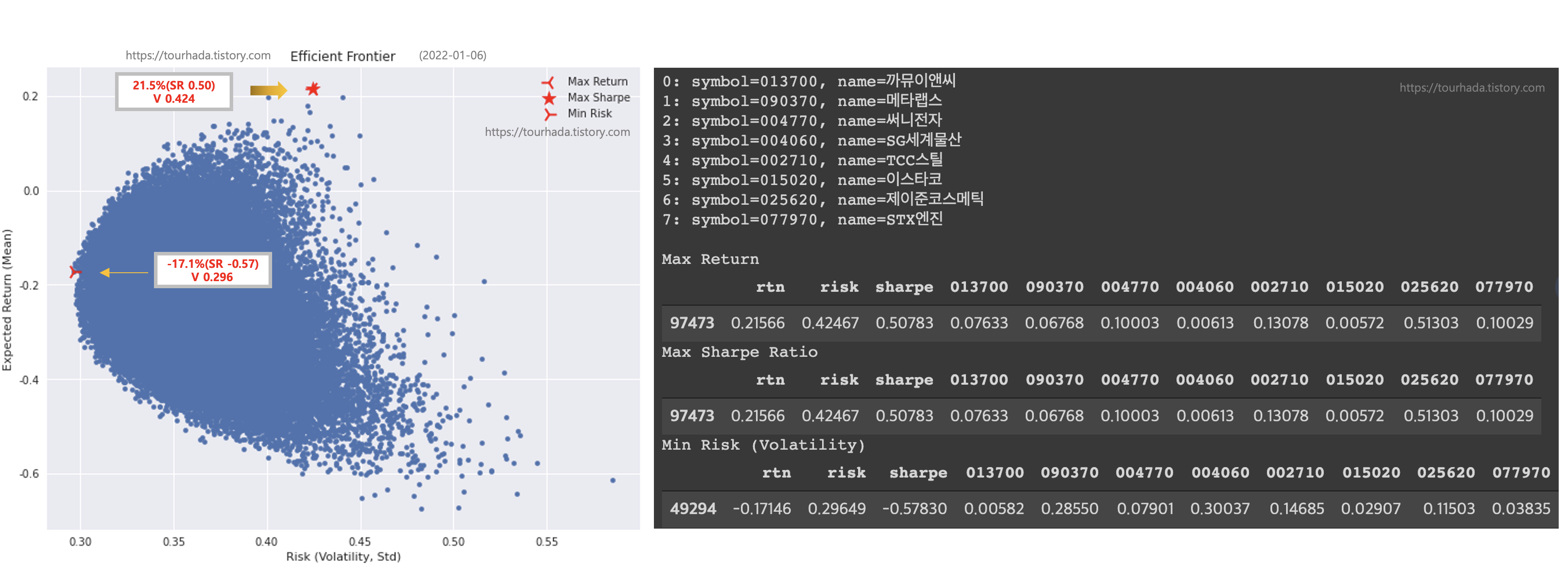 Efficient Frontier Portfolio 를 위한 몬테카를로 시뮬레이션으로 랜덤 포트폴리오를 구성해 보았다.