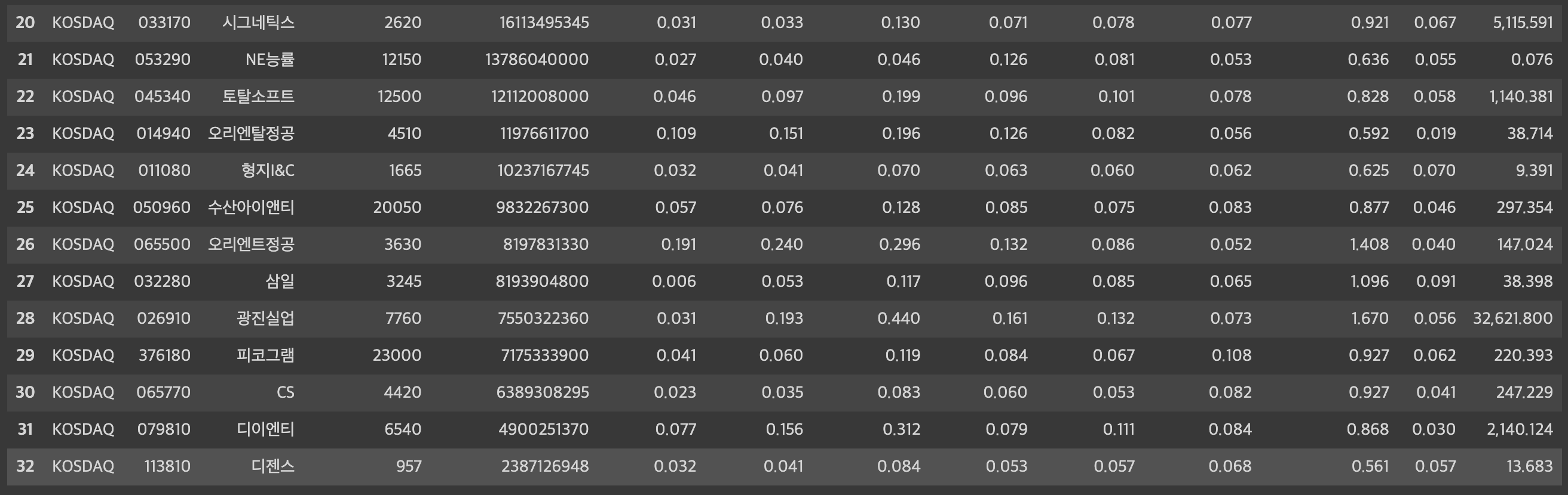 | KOSDAQ | 376180 | 피코그램 | 23000 | 7175333900 | 0.041 | 0.060 | 0.119 | 0.084 | 0.067 | 0.108 | 0.927 | 0.062 | 220.393 |