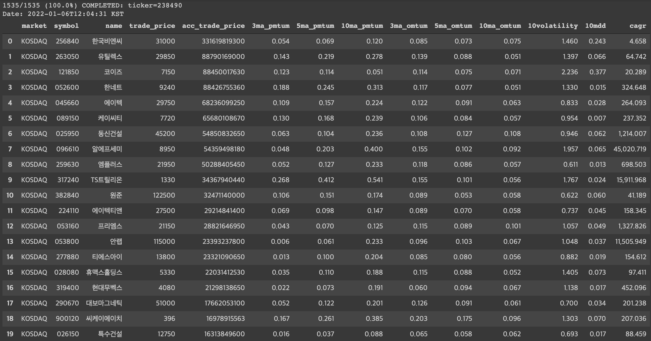 앞서 차트 분석을 통한 변동성과 모멘텀 전략으로 그래프가 우상향 하는 종목들만 랭킹을 뽑아서 거래대금과 연간환산수익률(CAGR) 이 높은 기준들로 분석했다. 실시간 거래 정보들은 주식은 KRX에 등록된 KOSPI 942개(2022년 1월 3일 기준)와 KOSDAQ 1536개(2021년 1월 3일기준), 코인은 업비트(upbit)에 상장된 109개(2022년 1월 3일 기준)중에서 분석 기준시점에 추천 목록을 자동으로 데이터 모델링을 해보았다.