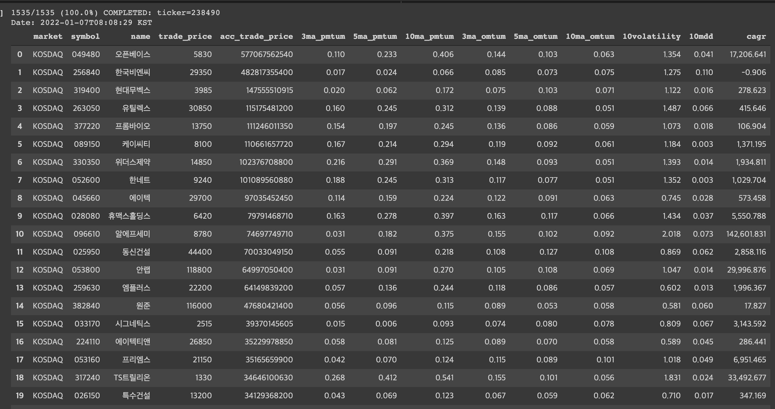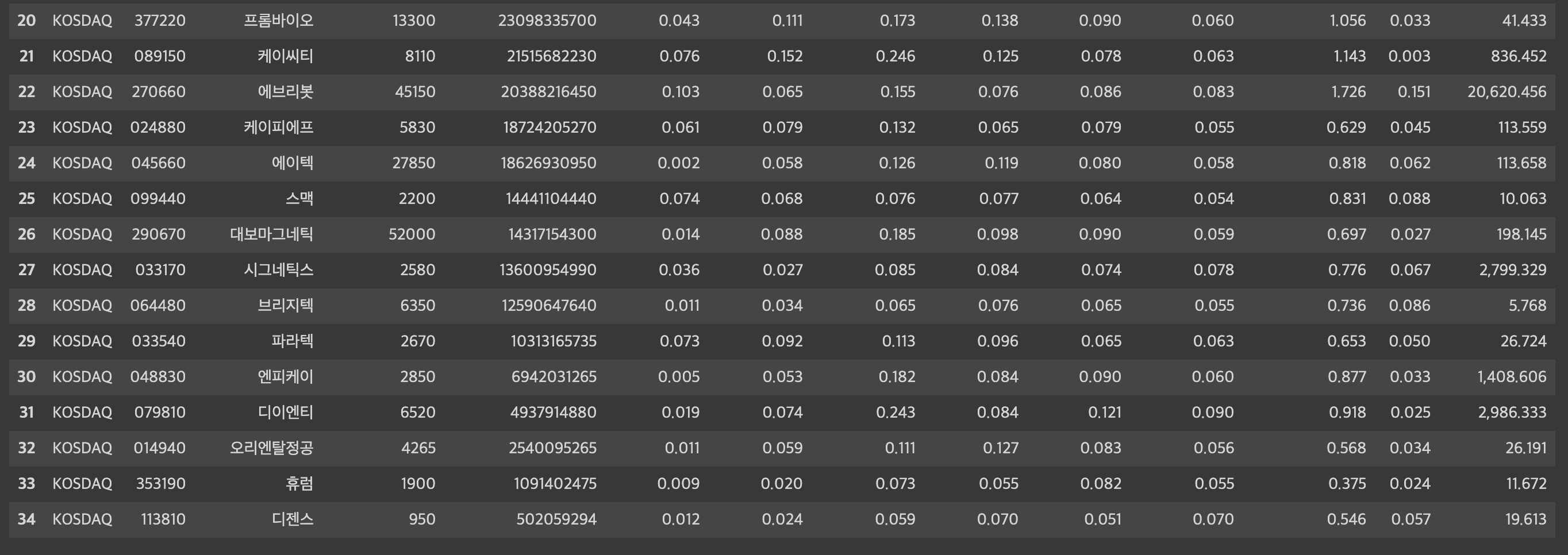 | KOSDAQ | 376180 | 피코그램 | 21950 | 10134990200 | 0.012 | 0.023 | 0.074 | 0.084 | 0.067 | 0.108 | 0.894 | 0.062 | 319.186 |