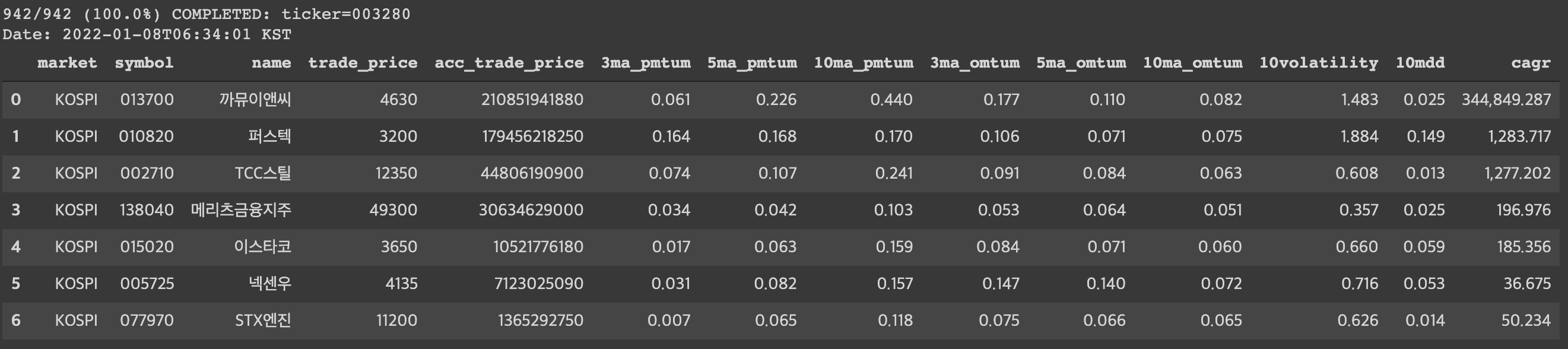 앞서 차트 분석을 통한 변동성과 모멘텀 전략으로 그래프가 우상향 하는 종목들만 랭킹을 뽑아서 거래대금과 연간환산수익률(CAGR) 이 높은 기준들로 분석했다. 실시간 거래 정보들은 주식은 KRX에 등록된 KOSPI 942개(2022년 1월 3일 기준)와 KOSDAQ 1536개(2021년 1월 3일기준), 코인은 업비트(upbit)에 상장된 109개(2022년 1월 3일 기준)중에서 분석 기준시점에 추천 목록을 자동으로 데이터 모델링을 해보았다.