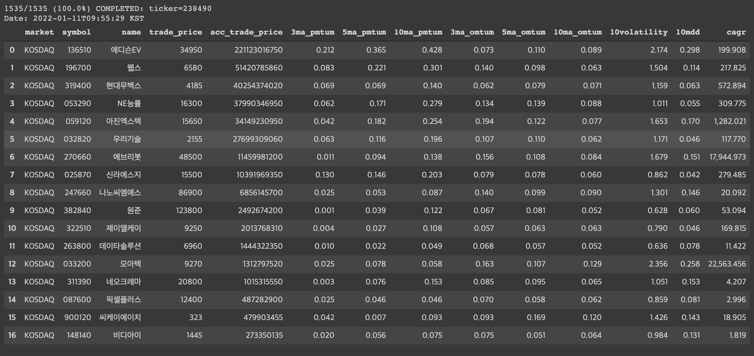 앞서 차트 분석을 통한 변동성과 모멘텀 전략으로 그래프가 우상향 하는 종목들만 랭킹을 뽑아서 거래대금과 연간환산수익률(CAGR) 이 높은 기준들로 분석했다. 실시간 거래 정보들은 주식은 KRX에 등록된 KOSPI 942개(2022년 1월 3일 기준)와 KOSDAQ 1536개(2021년 1월 3일기준), 코인은 업비트(upbit)에 상장된 109개(2022년 1월 3일 기준)중에서 분석 기준시점에 추천 목록을 자동으로 데이터 모델링을 해보았다.