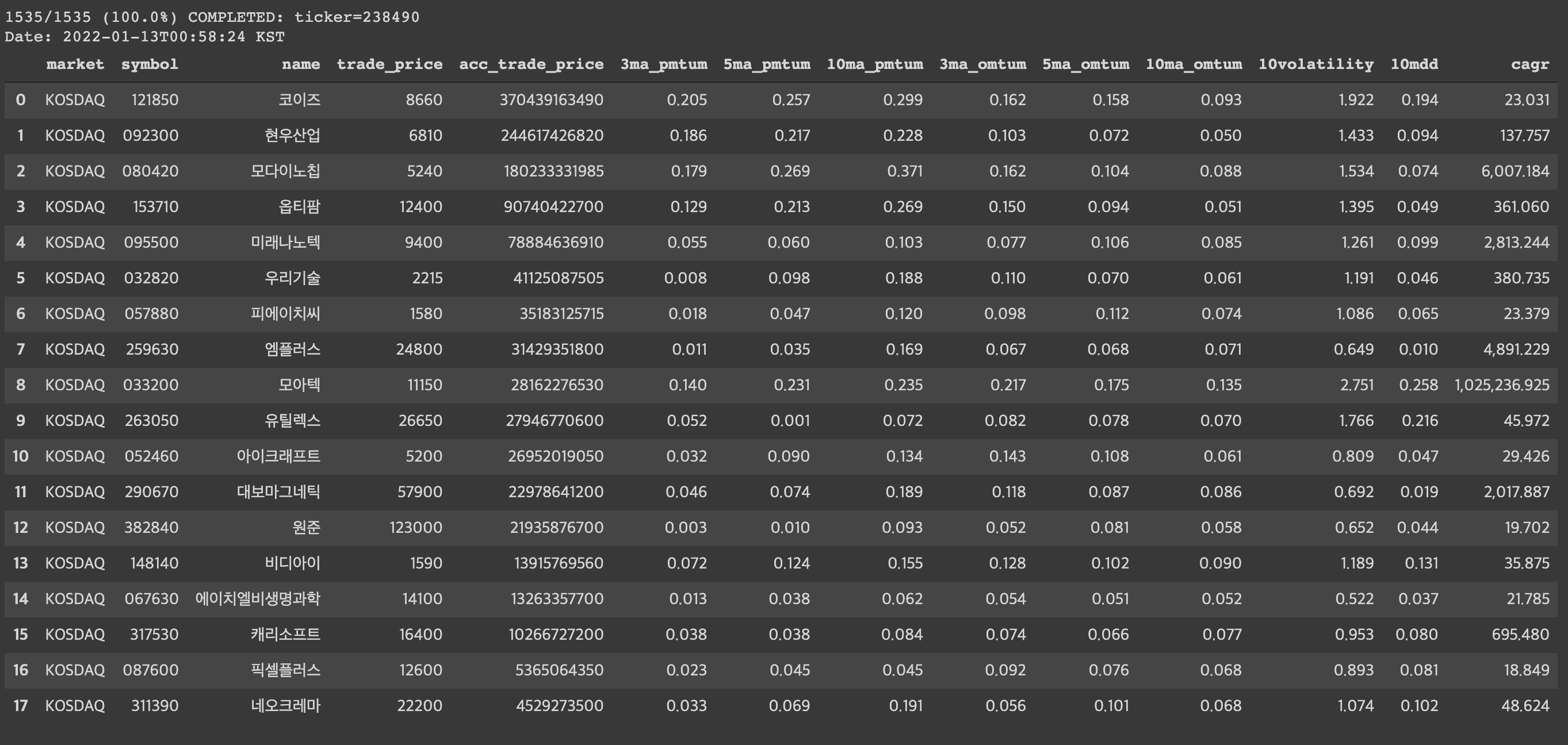 앞서 차트 분석을 통한 변동성과 모멘텀 전략으로 그래프가 우상향 하는 종목들만 랭킹을 뽑아서 거래대금과 연간환산수익률(CAGR) 이 높은 기준들로 분석했다. 실시간 거래 정보들은 주식은 KRX에 등록된 KOSPI 942개(2022년 1월 11일 기준)와 KOSDAQ 1535개(2021년 1월 11일기준), 코인은 업비트(upbit)에 상장된 110개(2022년 1월 11일 기준 위믹스(WEMIX) 신규상장 )중에서 분석 기준시점에 추천 목록을 자동으로 데이터 모델링을 해보았다.