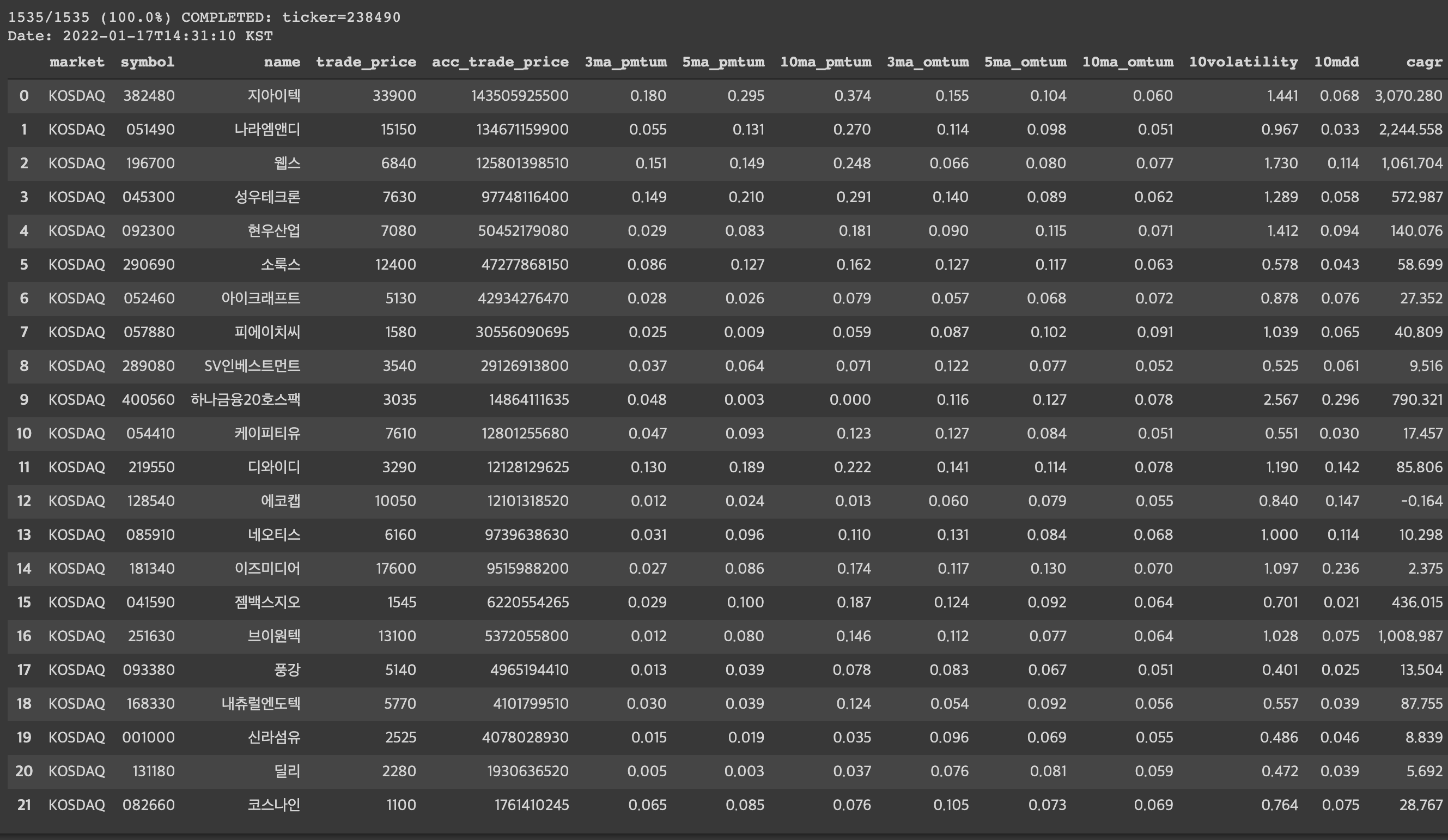 앞서 차트 분석을 통한 변동성과 모멘텀 전략으로 그래프가 우상향 하는 종목들만 랭킹을 뽑아서 거래대금과 연간환산수익률(CAGR) 이 높은 기준들로 분석했다. 실시간 거래 정보들은 주식은 KRX에 등록된 KOSPI 942개(2022년 1월 11일 기준)와 KOSDAQ 1535개(2021년 1월 11일기준), 코인은 업비트(upbit)에 상장된 110개(2022년 1월 11일 기준 위믹스(WEMIX) 신규상장 )중에서 분석 기준시점에 추천 목록을 자동으로 데이터 모델링을 해보았다.