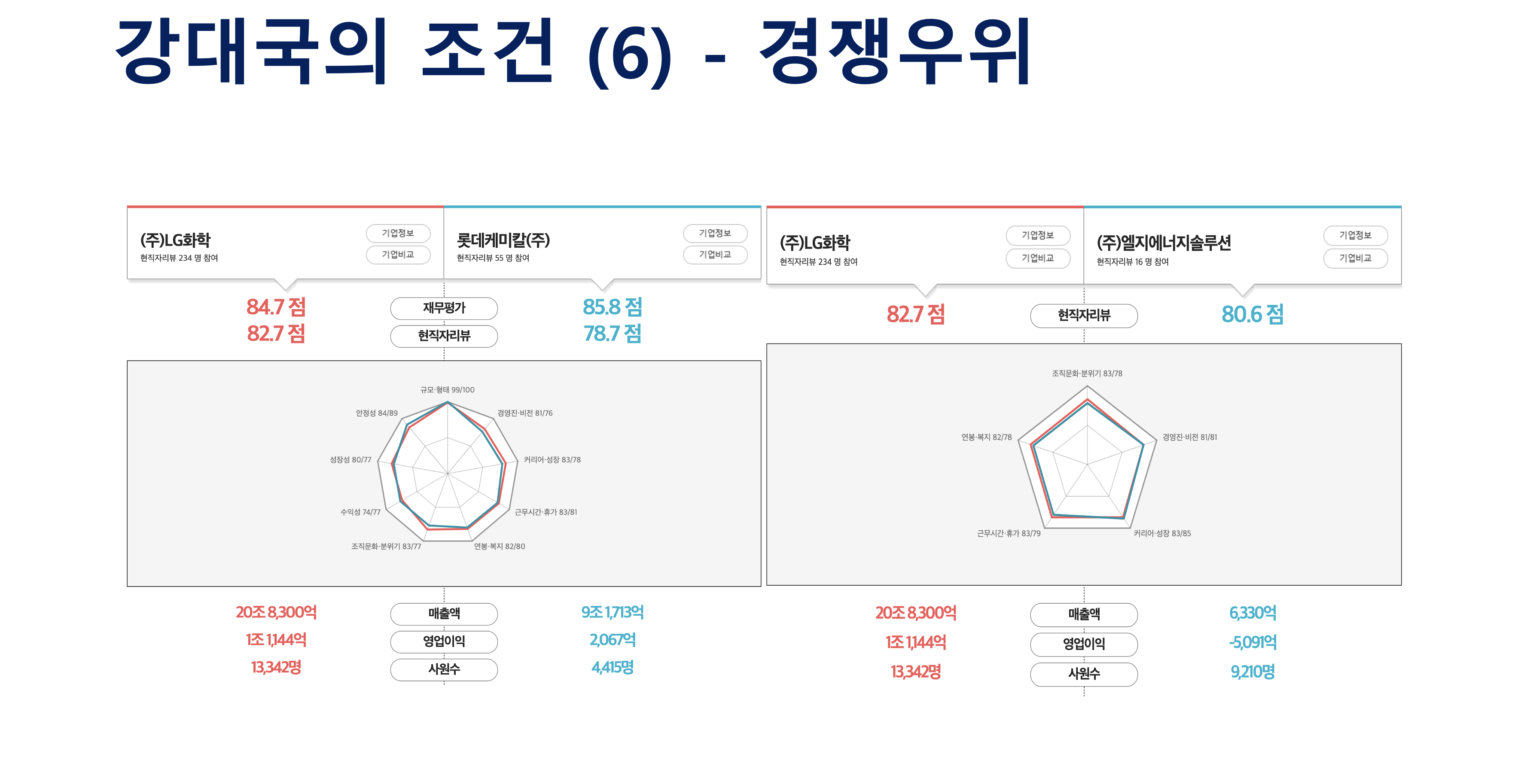 강대국의 조건을 확인하는데 고려요소는 재무평가와 현직자 리뷰로 평가점수를 고려 했고, 매출액이나 영업이익, 사원수를 통해서 직원 1명당 수익률를 따져보는것이 얼마나 이 기업이 효율적으로 잘 운영하는지 보는데 확실한 지표가 될 것입니다.