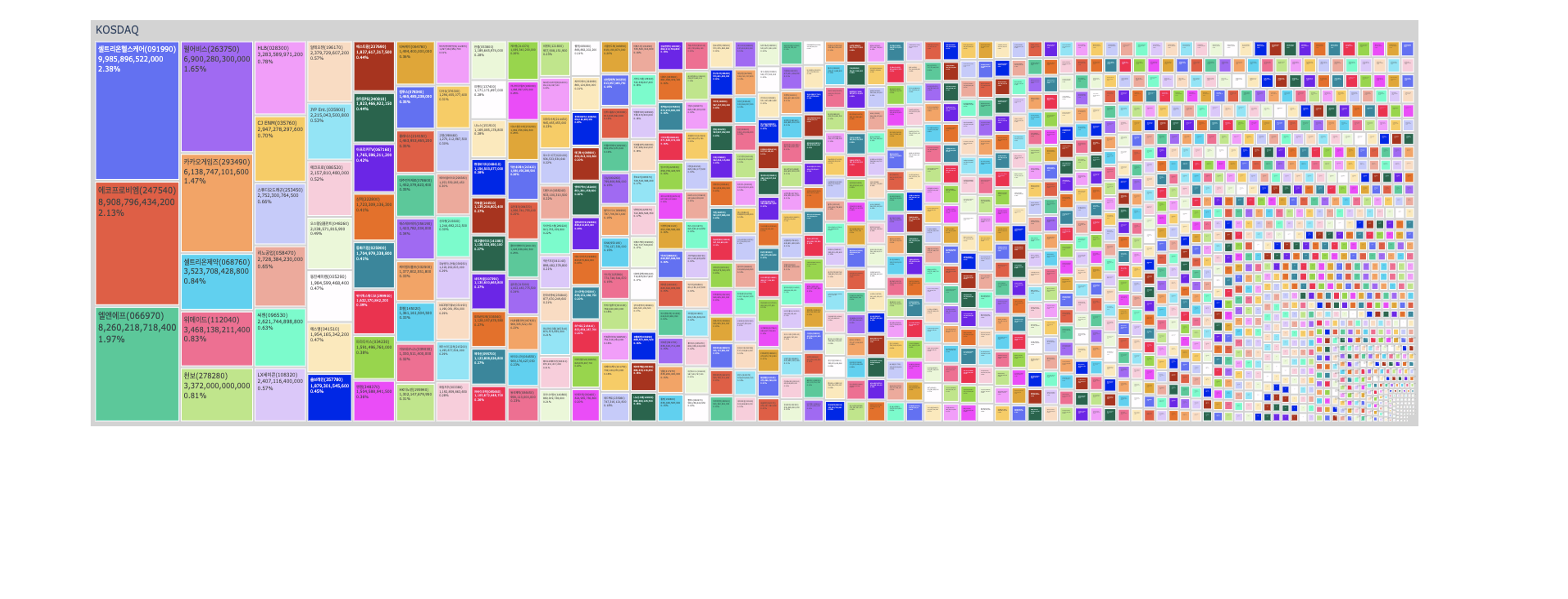 위 이미지는 코스닥(KOSDAQ)에 상장된 전체 기업을 시가총액을 전체 비율로 확인하기 위해 데이터로 분석한 그림입니다.