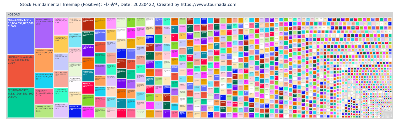 시가총액 데이터 분석은 코스피(KOSPI)와 코스닥(KOSDAQ) 두개로 나누었고, 2022년 4월 22일 기준으로 확인했다.
