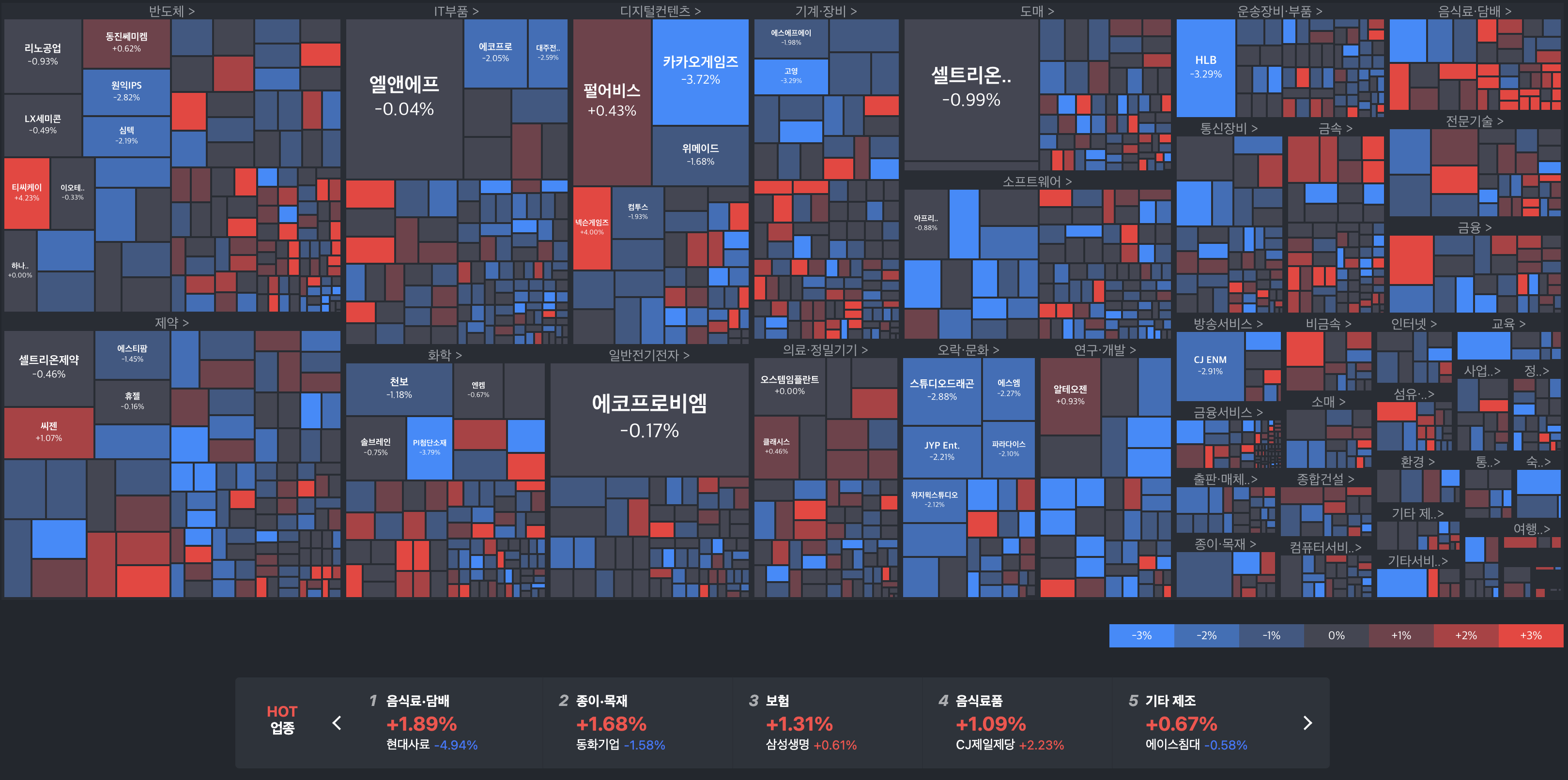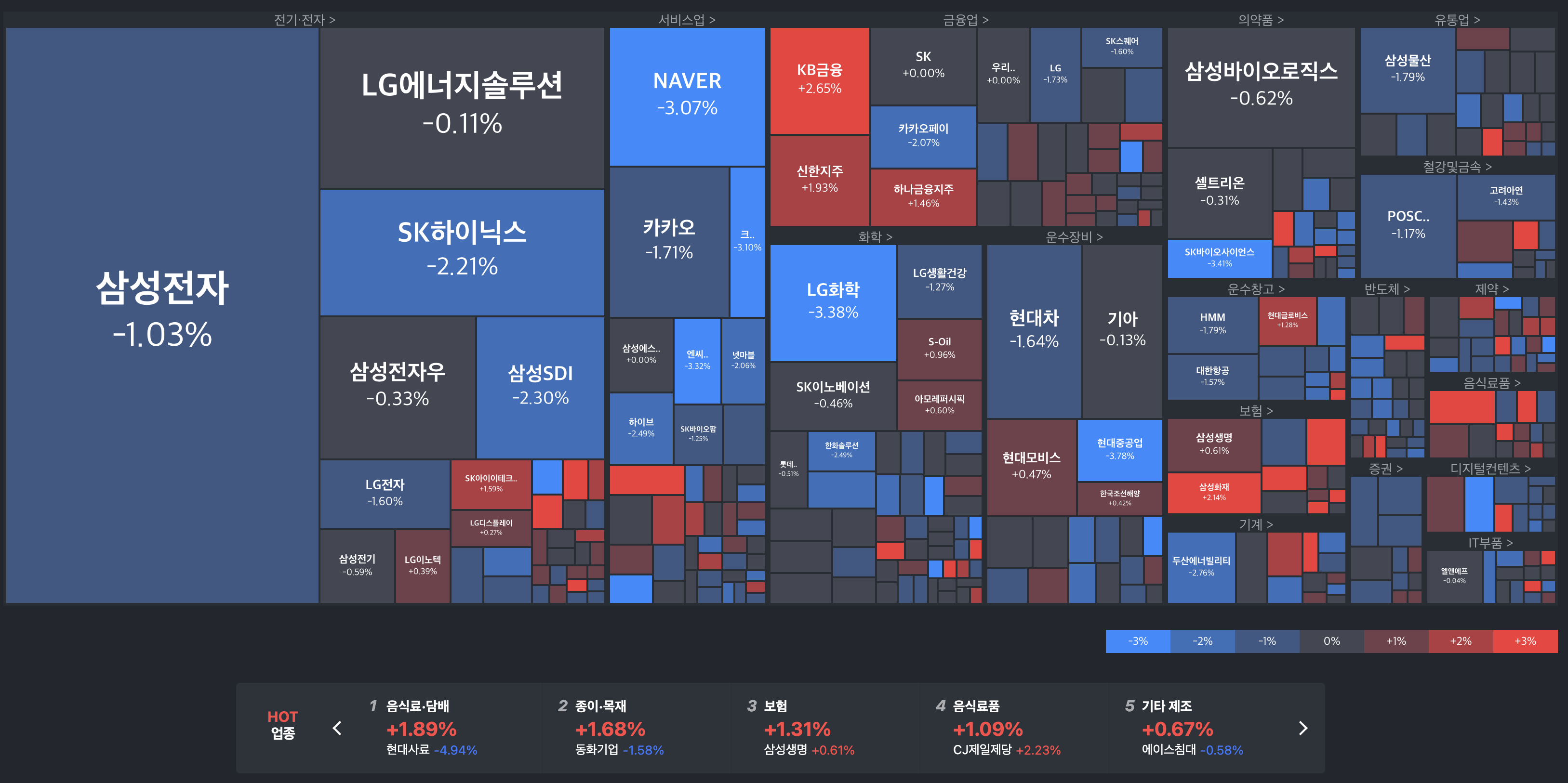 코스피 시가총액 상위 종목은 삼성전자, LG에너지솔루션, SK하이닉스, 삼성바이오로직스, 삼성전자우, NAVER, 카카오, 삼성SDI, 현대차, LG화학 순이다. 코스닥 시가총액 상위는 에코프로비엠, 셀트리온헬스케어, 엘앤에프, 펄어비스, 카카오게임즈, 셀트리온제약, HLB, CJENM, 리노공업, 위메이드 순이다.