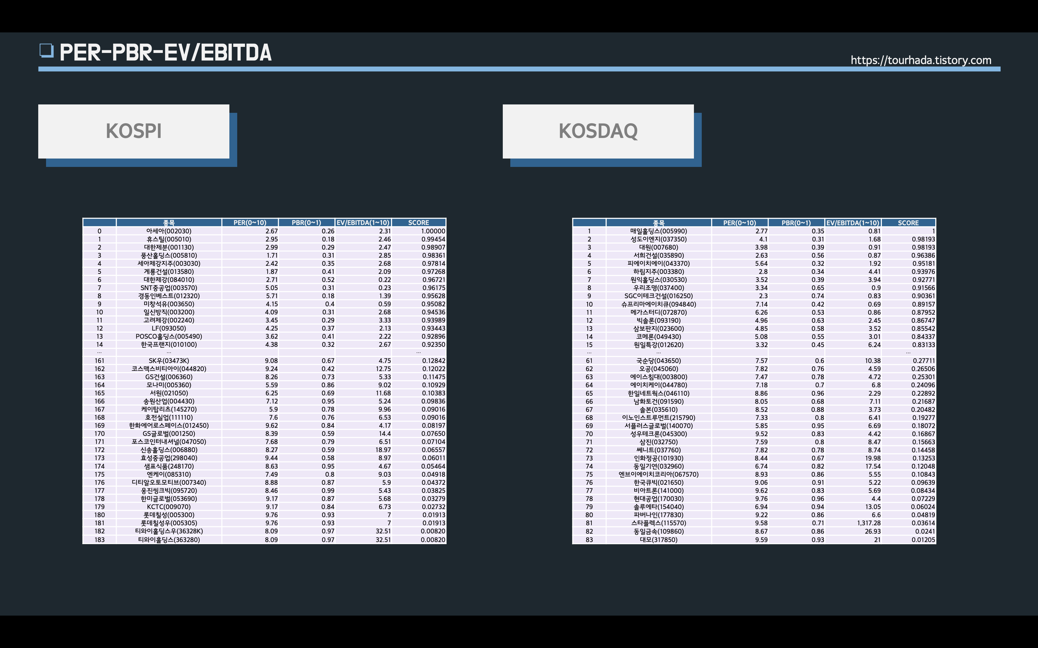 이와 관련된, 지표들 중에 상대가치평가에 쓰이는 PER-PBR-EV/EBITDA 세가지는 저평가 된 기업순으로 하고, 자기자본 순이익률 ROE 지표를 추가해서 데이터 모델링으로 최고값과 최소값의 평균가중치로 백분위로 나눠서 서열을 재정리 해보았다. 여기서, 자기자본이익률 ROE 기준은 워렌버핏 투자 기준인 15% 기준값으로 기준선을 잡았다