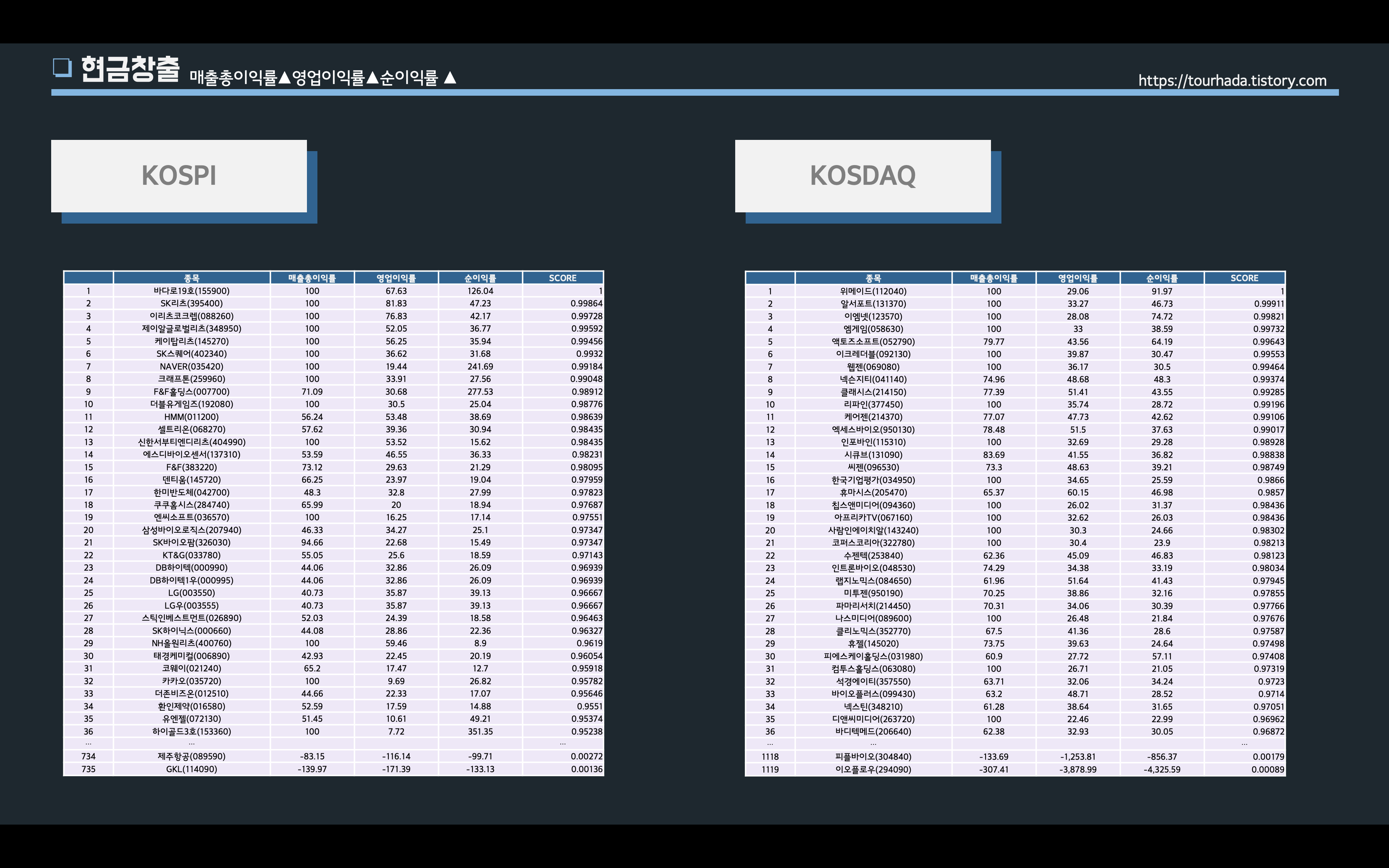 이와 관련된, 지표들 중에 매출총이익률, 영업이익률, 순이이률 세가지를 데이터 모델링으로 최고값과 최소값의 평균가중치로 백분위로 나눠서 서열을 재정리 해보았다.
