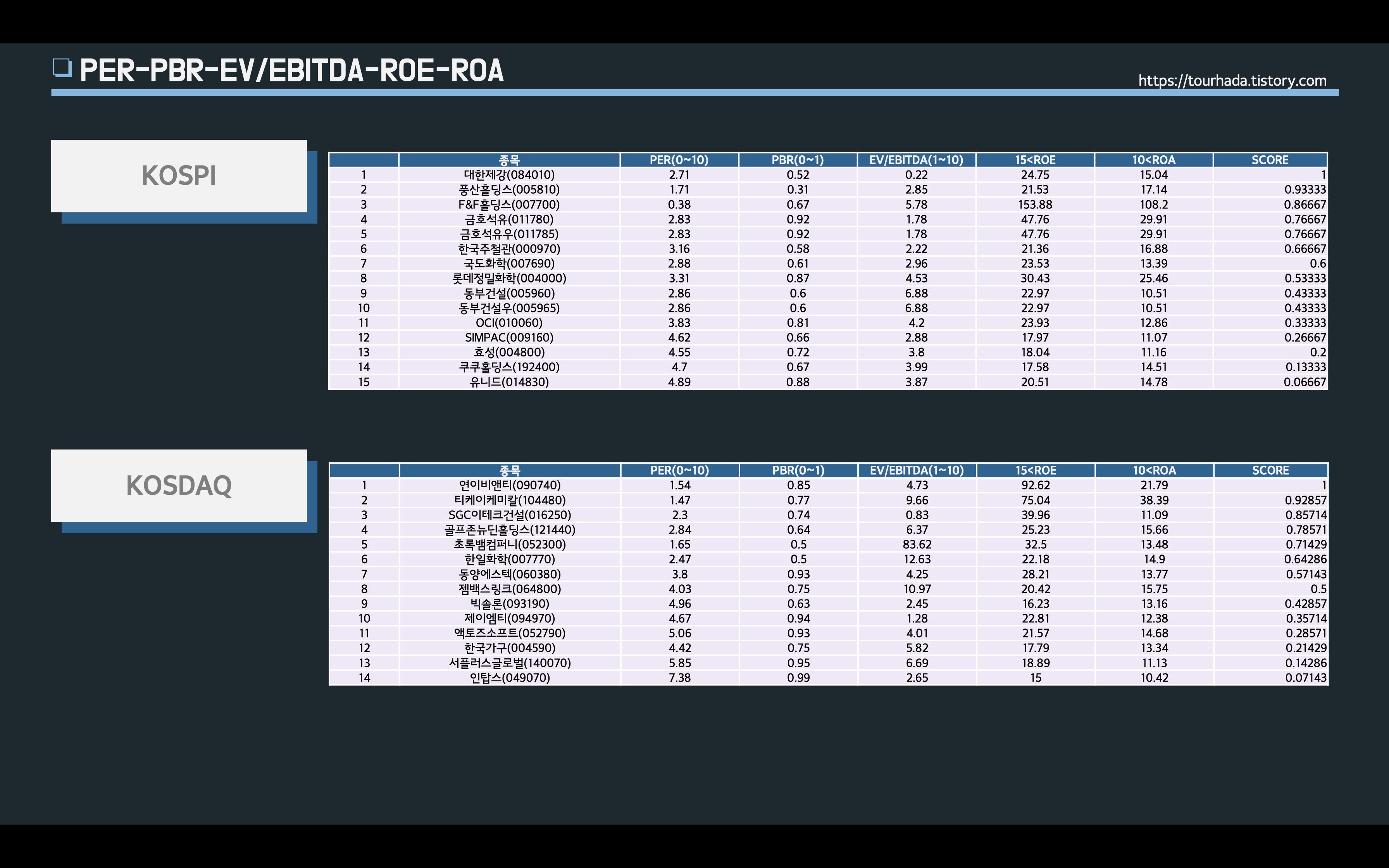 이와 관련된, 지표들 중에 상대가치평가에 쓰이는 PER-PBR-EV/EBITDA 세가지는 저평가 된 기업순으로 하고, 자기자본 순이익률 ROE와 총자산 순이익률 ROA 두가지 지표를 추가해서 데이터 모델링으로 최고값과 최소값의 평균가중치로 백분위로 나눠서 서열을 재정리 해보았다. 여기서, 자기자본이익률 ROE 기준은 워렌버핏 투자 기준인 15% 기준값으로 기준선을 잡았고, ROA는 부채를 포함한 총자산 대비 수익률이라서 통상적으로 좀더 낮게 나오는 10% 기준으로 잡았다.