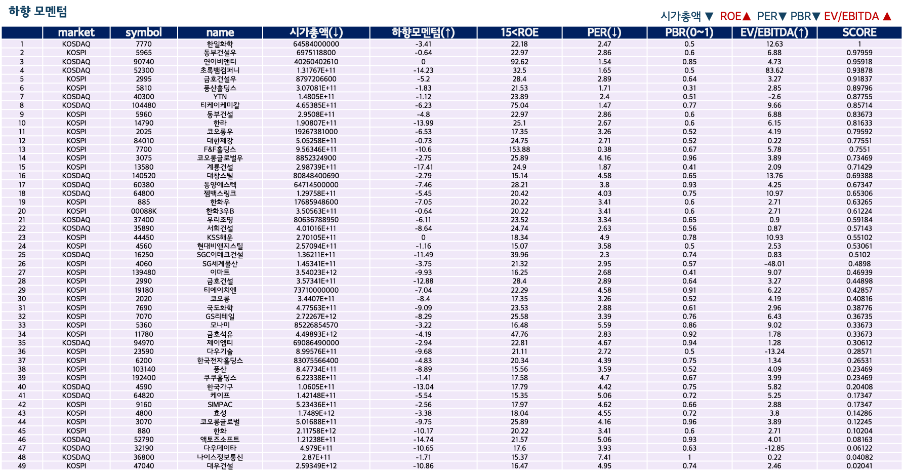 - 분석은 국내 상장된 코스피(KOSPI) 와 코스닥(KOSDAQ) 시장에 있는 기업들을 중에 하향 모멘텀에 해당된 49개 기업들을 대상으로 분석했다.