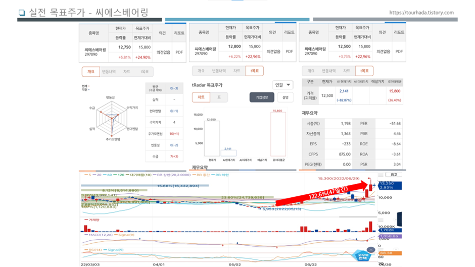 씨에스윈드의 자회사인 씨에스베어링의 로이터평균 목표주가는 15,800원으로 분석기준일 현재주가 12,750원 대비 24.9% 상승여력이 있다고 볼 수 있습니다. AI분석 현재가치 2,141원으로 주가 하락시 최저가를 참고해 봐야겠습니다. 펀더멘털에 비해 수급과 주가모멘텀이 강하게 나타나는 종목이라 할 수 있습니다. 최근 4개월간 중 최저가 5,953원(2022.5.13) 대비 현재 투자 수익률은 122.6%로 47일간 보유기간으로 연평균 수익률로 환산해보면 652.1%가 됩니다.