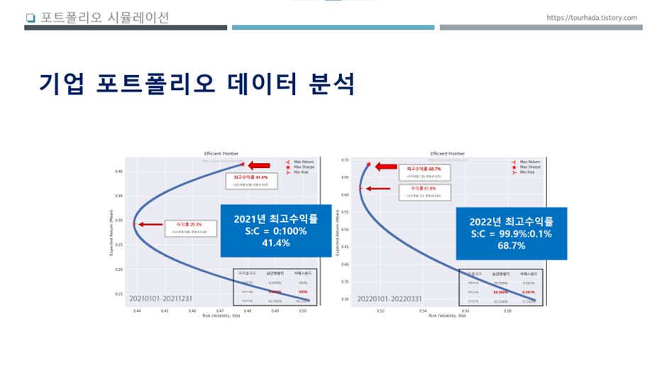 이것을 다시 2021년 기준(2021.1.1~12.31)과 2022년 기준(2022.1.1~3.31) 나눠서 분석했을때는 2021년에는 씨에스윈드를 100% 투자했을때 최고수익률이 41.4%(샤프비율 0.86, 위험 변동성 0.47)로 나왔고, 2022년은 삼강엠앤티와 씨에스윈드 비중을 반대로 99.9%:0.01% 비율로 투자했을 때, 최고수익률이 68.7%(샤프비율 1.33, 위험 변동성 0.51)로 나왔습니다.