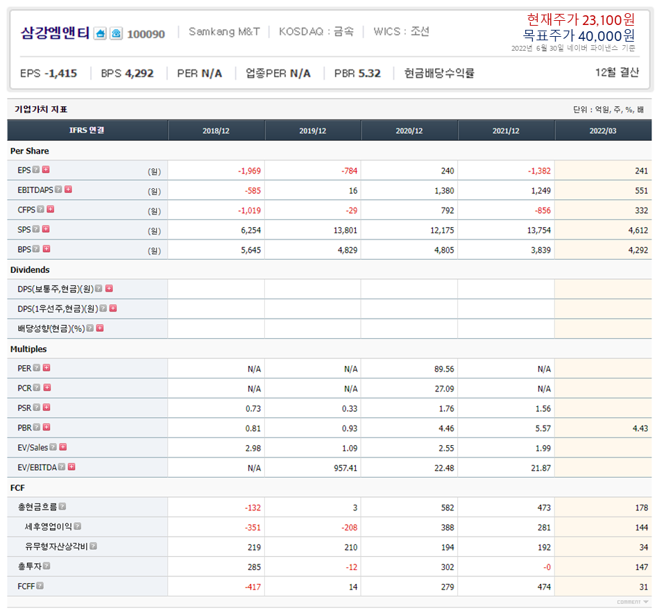 씨에스베어링 시가총액이 대략 0.1조(매출액 0.1조, 영업이익 5억) 가량되고, 삼강엠앤티은 대략0.8조(매출액 0.5조, 영업이익 264억) 입니다만, 주당순이익(EPS)은 씨에스윈드를 제외하고는 현재 씨에스베어링 각각 마이너스로 233원과 1,410원 손실 중입니다. 이 값은 주가이익비율에 영향을 미쳐서 씨에스베어링과 삼강엠앤티 PER값이 각각 -51.68배와 -14.25배가 되었습니다. 이 두기업은 자기자본대비수익률(ROE)이 -8.64%와 -30.90%로 마이너스 성장을 보이는 이유가 투자금 포함한 수익률(ROA)값은 -3.61%와 -6.81%로 투자를 통한 성장률은 높은 것으로 확인됩니다.