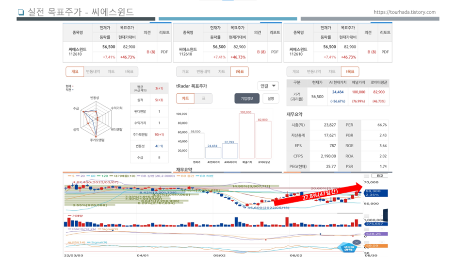 위 분석내용을 요약하자면, 씨에스윈드의 로이터평균 목표주가는 82,900원으로 분석기준일 현재주가 56,500원 대비 46.73% 상승여력이 있다고 볼 수 있겠습니다. 애널리스트 목표주가는 100,00원이고, AI분석 현재가치 24,484원와 미래가치 32,793원으로 참고해 볼만 하겠습니다. 실적에 비해 수급과 주가모멘텀이 강한 종목이라고 볼 수 있겠습니다. 최근 4개월간 중 최저가 45,600원(2022.5.13) 대비 현재 투자 수익률은 27.8%로 47일간 보유기간으로 개장일 연평균 250일 기준으로 수익률로 환산해보면 147.9%이 됩니다.