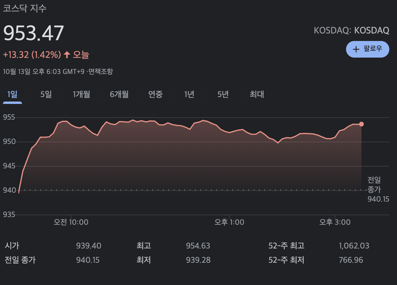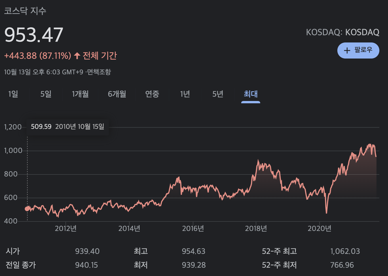 최고치는 2000년 3월 10일 장중에 기록했던 2925.20이 최고치이다. 2021년1월 7일 기준으로 코스닥 지수는 986.86포인트로 7.47포인트가 올랐고 등락율은 +0.76%이다.