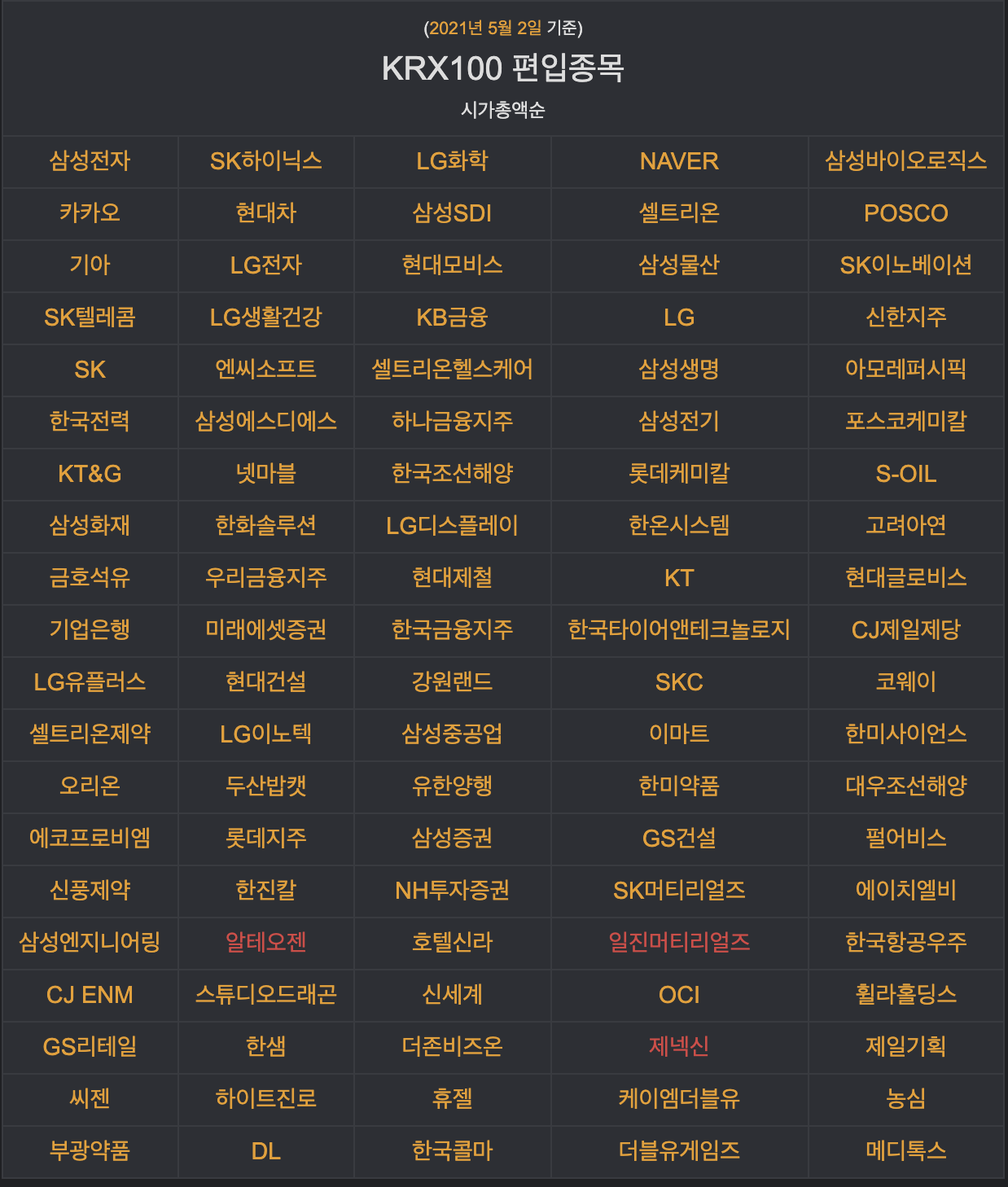 | (2021년 5월 2일 기준) KRX100 편입종목 시가총액순 |