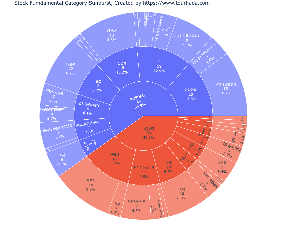 전체적으로 5월(5.1)부터 현재(7.22)까지 대략 3개월간 자료로 분석된 기업은 산업재 분야 32개 기업중에 자본재와 운송, 상업서비스와 공급용이 가장 많은 비율을 차지 했다. 그다음으로 건강관리 분야중에 제약과 생물공학, 건강관리장비와서비스 업종들 비중이 높았다. 세번째로는 소재 분야업종들이고, 그다음이 경기관련 소비재 분야중에 자동차와부품, 내구소비자와의류 였다. 그뒤 바로 IT 분야중에 기술하드웨어와장비, 소프트웨어와서비스, 전자와 전기제품 이 비중이 차지했다. 그 다음부터는 커뮤니케이션서비스 분야, 필수소비재 분야, 유틸리티 분야 순으로 이어졌다.