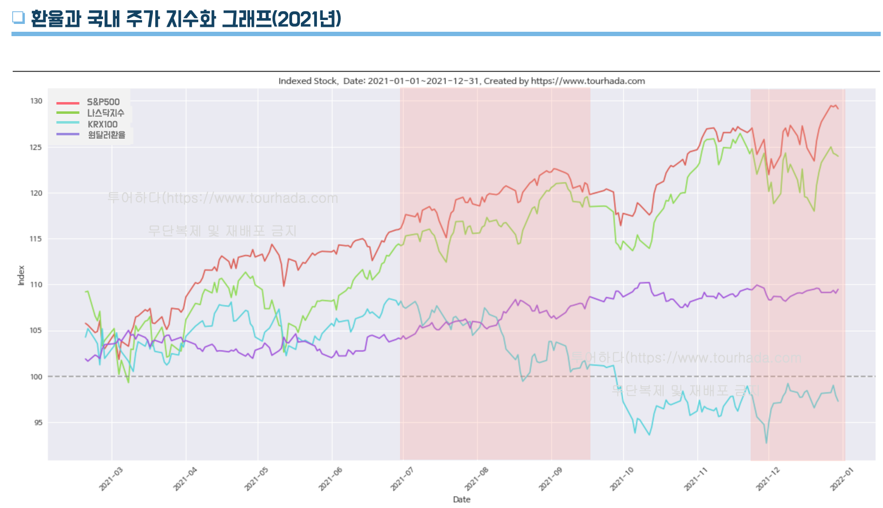 2021년 S&P500 지수가 상승할때 나스닥지수는 같이 욺직였고, 환율 상승이 이루어지던 시기에 국내 KRX100 지수는 하락하는 것을 볼 수 있습니다. 2022년 환율은 여전히 상승중이지만 S&P500지수가 점차 하락해가면서 나스닥지수와 국내 KRX100지수는 함께 하락하였습니다.